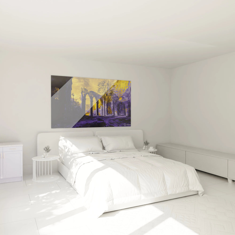 Ce tableau capture avec intensité la grandeur disparue des civilisations anciennes, sublimée par un jeu de clair-obscur poignant. Les contrastes entre les ombres violet profond et les éclats dorés créent une ambiance aussi mystérieuse que fascinante. Il instaure dans votre pièce une atmosphère enveloppante, presque onirique, qui invite à la rêverie et à la méditation.