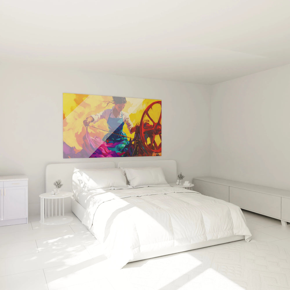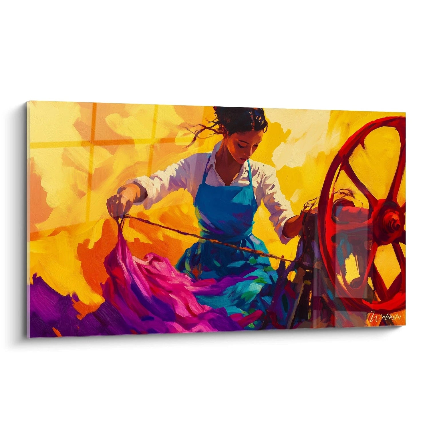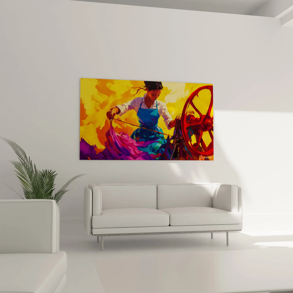 Imaginez ce tableau illuminant votre espace avec un jaune incandescent évoquant la chaleur du soleil au petit matin, tandis que le bleu du tablier apporte une touche de sérénité ancrée dans la réalité. Le rouge vif de la roue forme un point focal hypnotique, symbolisant la mécanique du travail et la persévérance inébranlable. Chaque coup de pinceau texturé vous transporte dans une danse entre maîtrise et fluidité, faisant vibrer votre pièce d’une intensité rare.