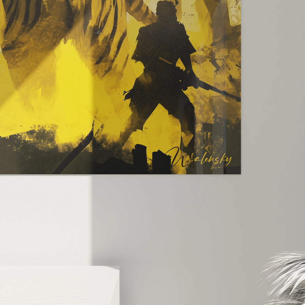 Imaginez la scène : une jungle baignée d’une lumière jaune éclatante, presque irréelle, qui fait vibrer chaque contour. Le tigre, figure majestueuse et sauvage, attire instantanément le regard avec ses rayures harmonieuses intégrées à cette luminosité intense. Face à lui, les silhouettes sombres et nettes des combattants semblent presque découper l’air, prêtes à l’affrontement dans une tension palpable. Le clair-obscur, réinterprété avec une touche contemporaine, apporte à l’ensemble un contraste saisissant, soulignant l’énergie dramatique et le suspense presque électrique de cet instant suspendu.