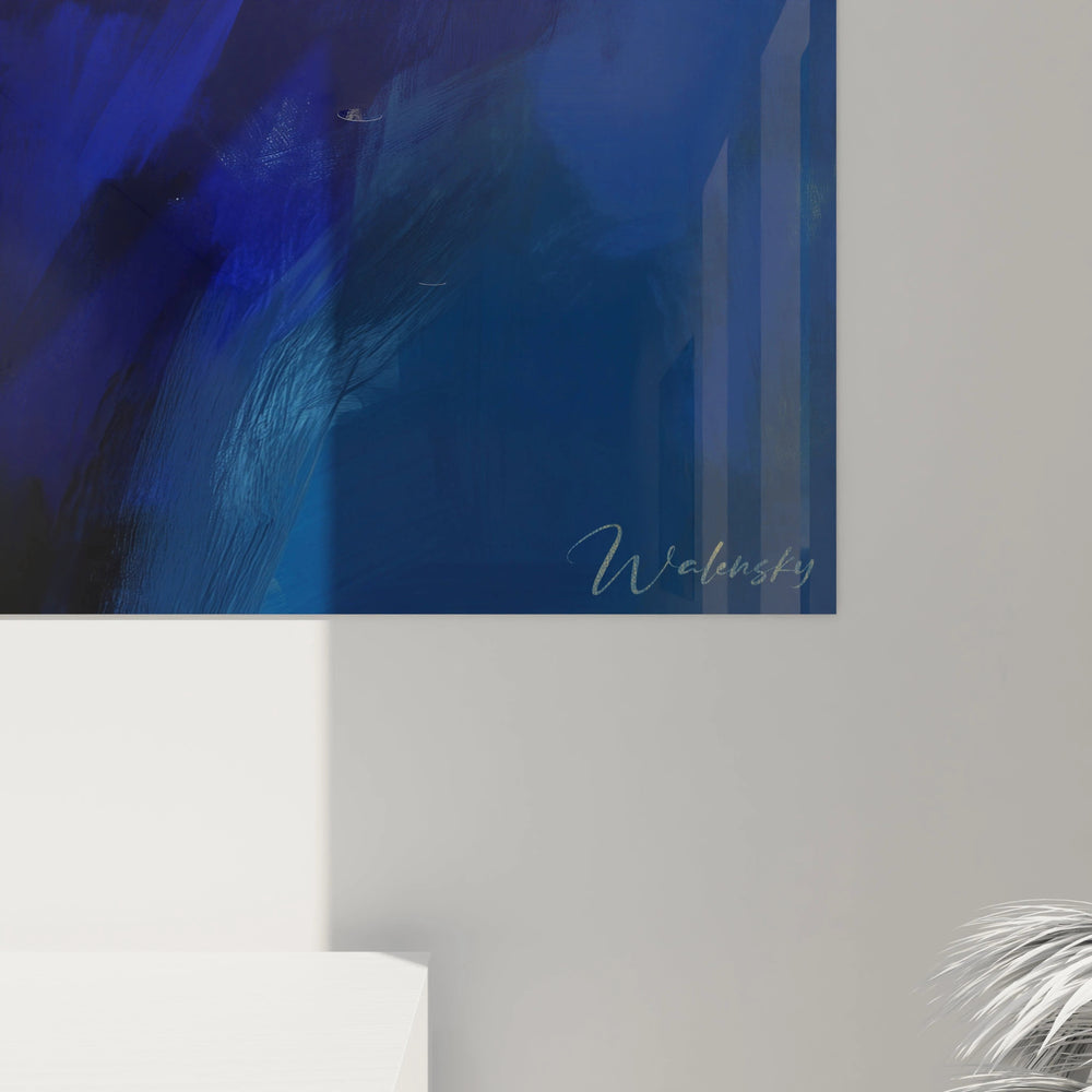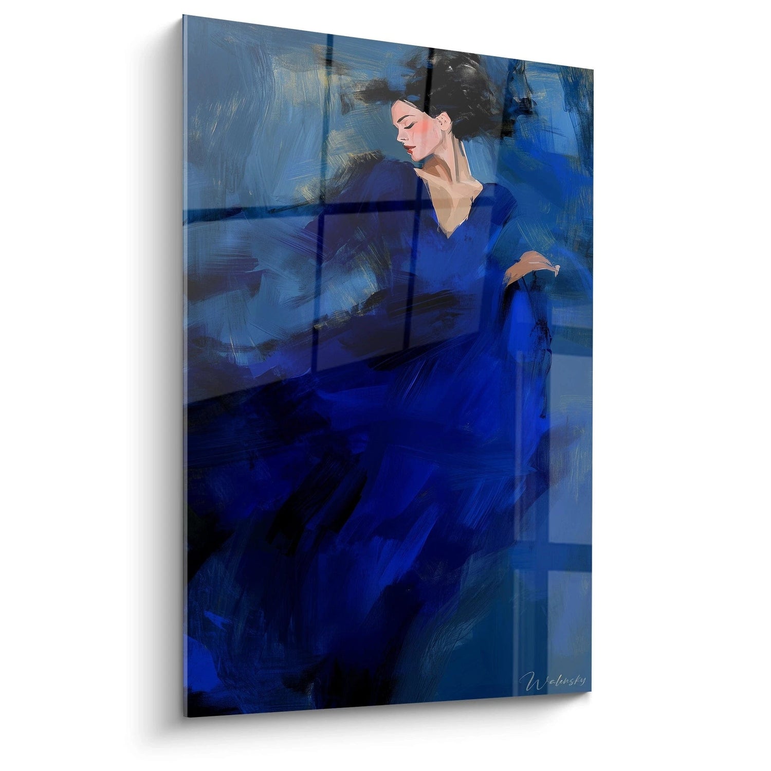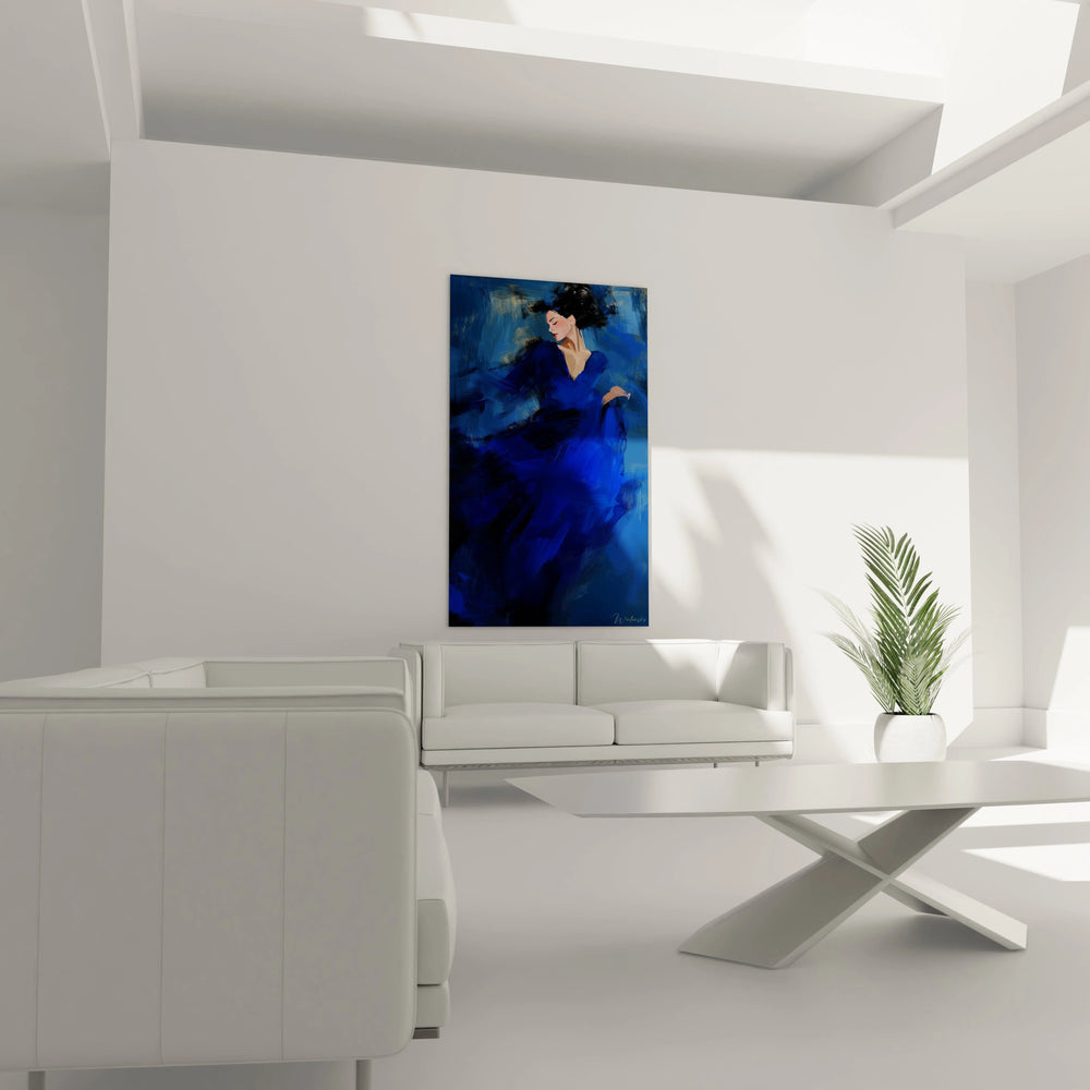 Imaginez-vous face à ce tableau, où chaque nuance de bleu marine enveloppe l’espace d’une atmosphère apaisante et raffinée. La figure féminine, délicatement esquissée, flotte comme dans un rêve, invitant vos pensées à s’évader vers un monde de contemplation et de calme intérieur. Les touches dorées, délicates et subtiles, illuminent la composition, insufflant une élégance rare qui élève l’âme.