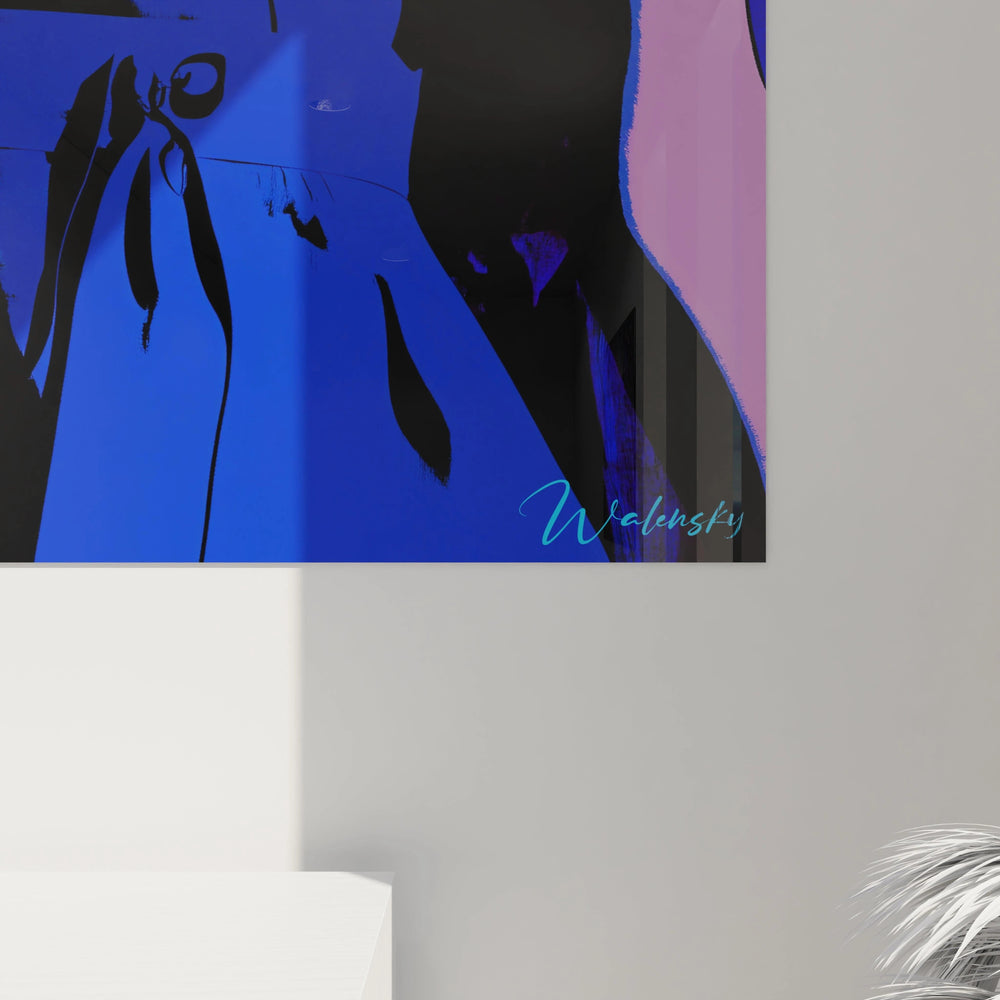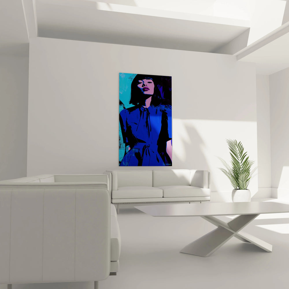 La force de cette création réside dans son graphisme acéré, où chaque ligne souligne la silhouette avec une précision presque sculpturale. La posture noble et assurée de la figure féminine, légèrement relevée, s'impose comme un symbole de confiance et d’assurance, prêt à habiter votre intérieur d’une aura unique. Les aplats de bleu profond de la robe et les jeux d’ombre noir intense créent un contraste saisissant, révélant au spectateur une tension esthétique pleine de vie et de caractère.