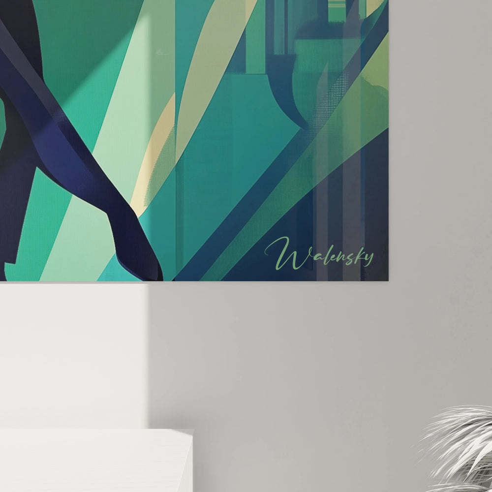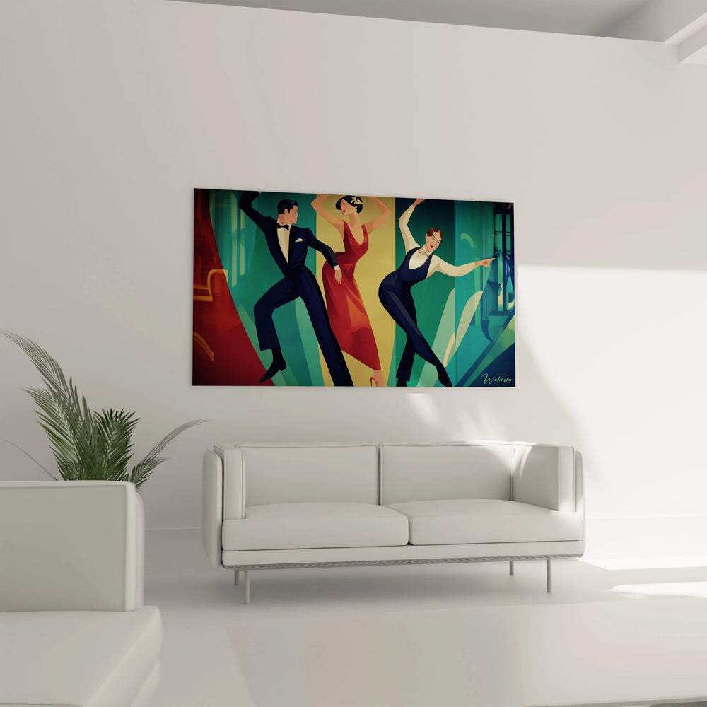 Imaginez une pièce vibrante d’émotions : les silhouettes stylisées se meuvent avec fluidité, leurs courbes et diagonales suggèrent une chorégraphie éternelle. La palette riche et profonde, mêlant rouge intense, bleu marine et or chaud, évoque un monde à la fois festif et raffiné. Chaque élément du tableau invite à ressentir la musique et l’effervescence d’un bal, insufflant une atmosphère luxueuse à votre décoration.