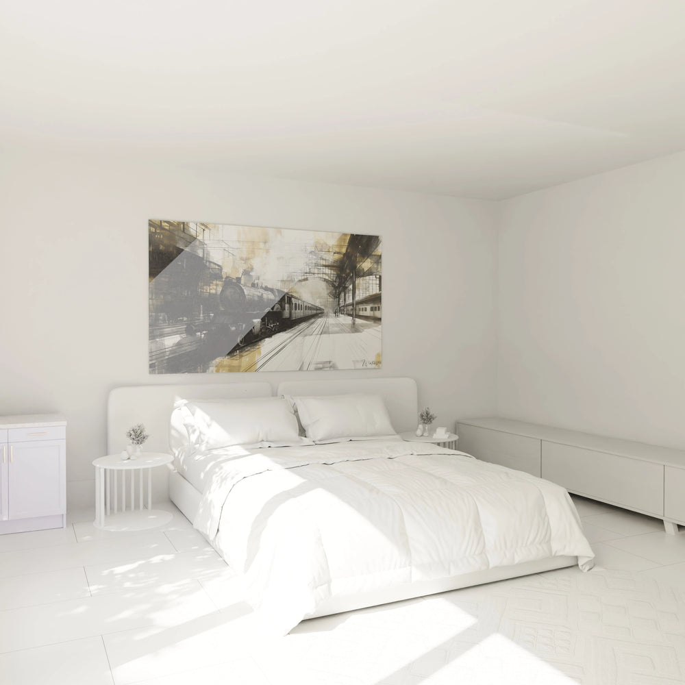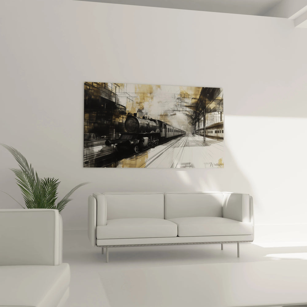 Chaque coup de pinceau raconte une histoire, celle d’une locomotive majestueuse enveloppée de fumée dorée, prête à s’élancer vers de nouveaux horizons. La gare Saint-Lazare devient alors un théâtre de vie, un espace vibrant où l’architecture métallique se fond dans une atmosphère lumineuse et presque onirique. Le subtil jeu de contrastes entre noir profond, or éclatant et gris délicat crée une ambiance à la fois nostalgique et contemporaine, invitant votre regard à voyager au-delà du visible.