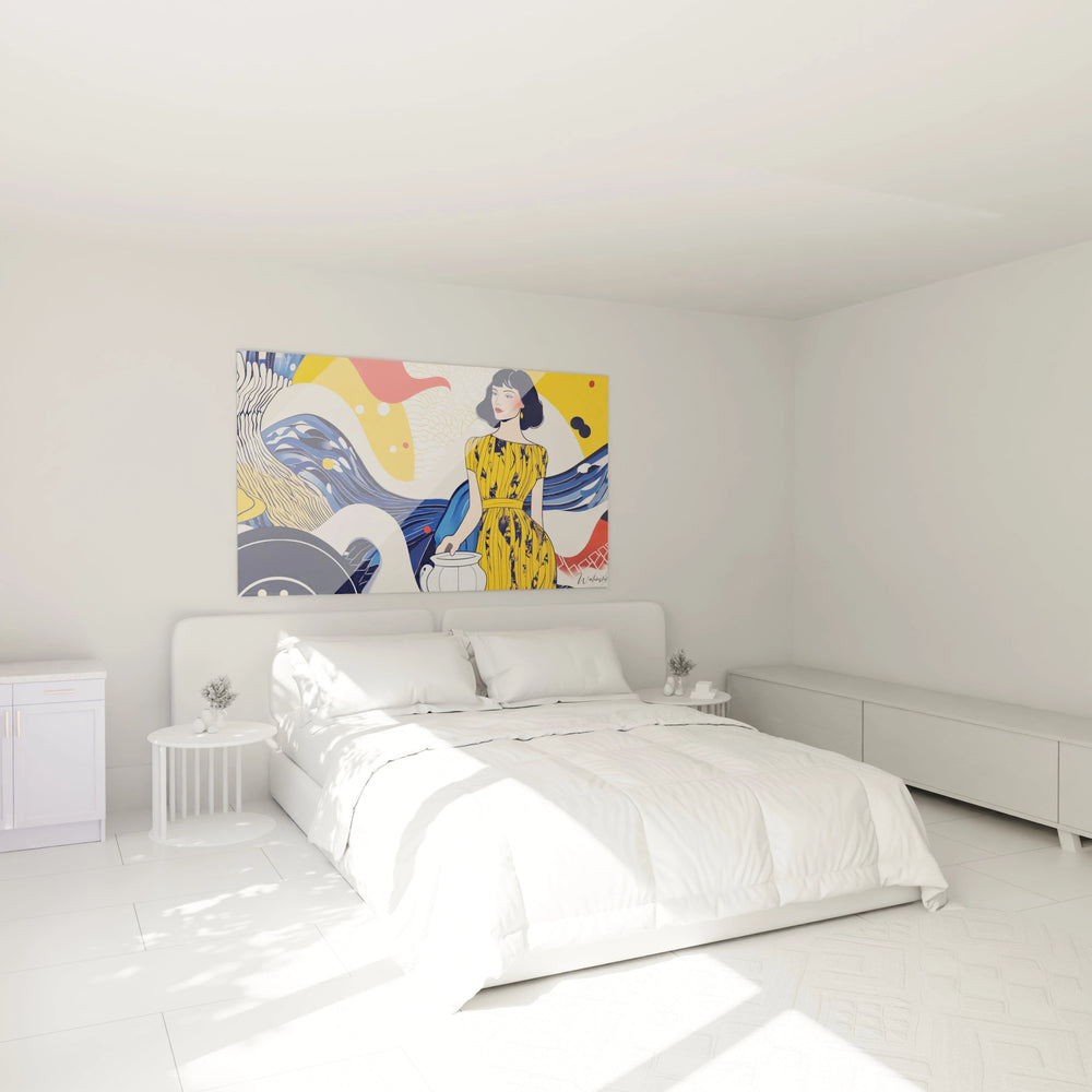 Le sujet principal, une figure fĂ©minine vĂȘtue dâun jaune Ă©clatant, rayonne dans un univers oĂč lâeau et la lumiĂšre dansent en parfaite symbiose. Le contraste audacieux entre le jaune solaire, le bleu profond et le blanc pur crĂ©e une profondeur visuelle saisissante. Chaque courbe semble animĂ©e, chaque dĂ©tail soigneusement pensĂ© pour Ă©voquer la fluiditĂ© du temps et lâĂ©quilibre des forces naturelles.