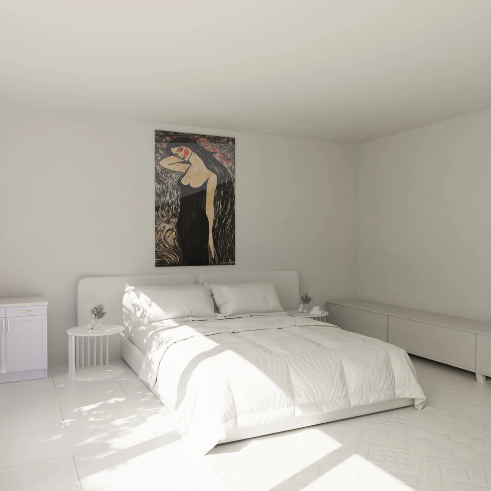 Découvrez une œuvre unique qui transcende le simple décor pour devenir un véritable voyage au cœur de l’âme humaine. Ce tableau s’inspire de La Madone de Edvard Munch, célébrant avec finesse la complexité des émotions entre désir et solitude. Chaque regard posé sur cette pièce puissante est une plongée dans un univers où passion et mélancolie s'entrelacent subtilement.