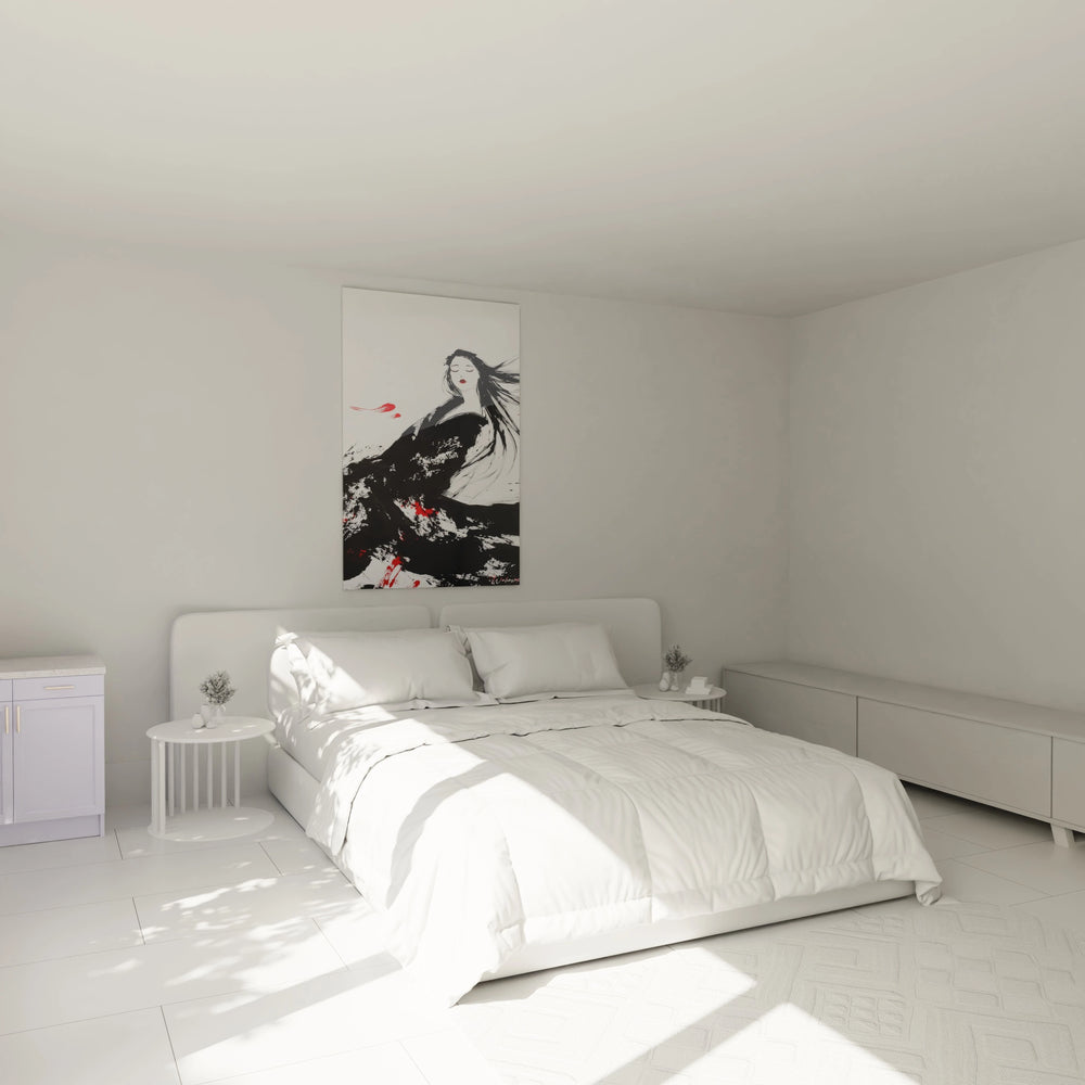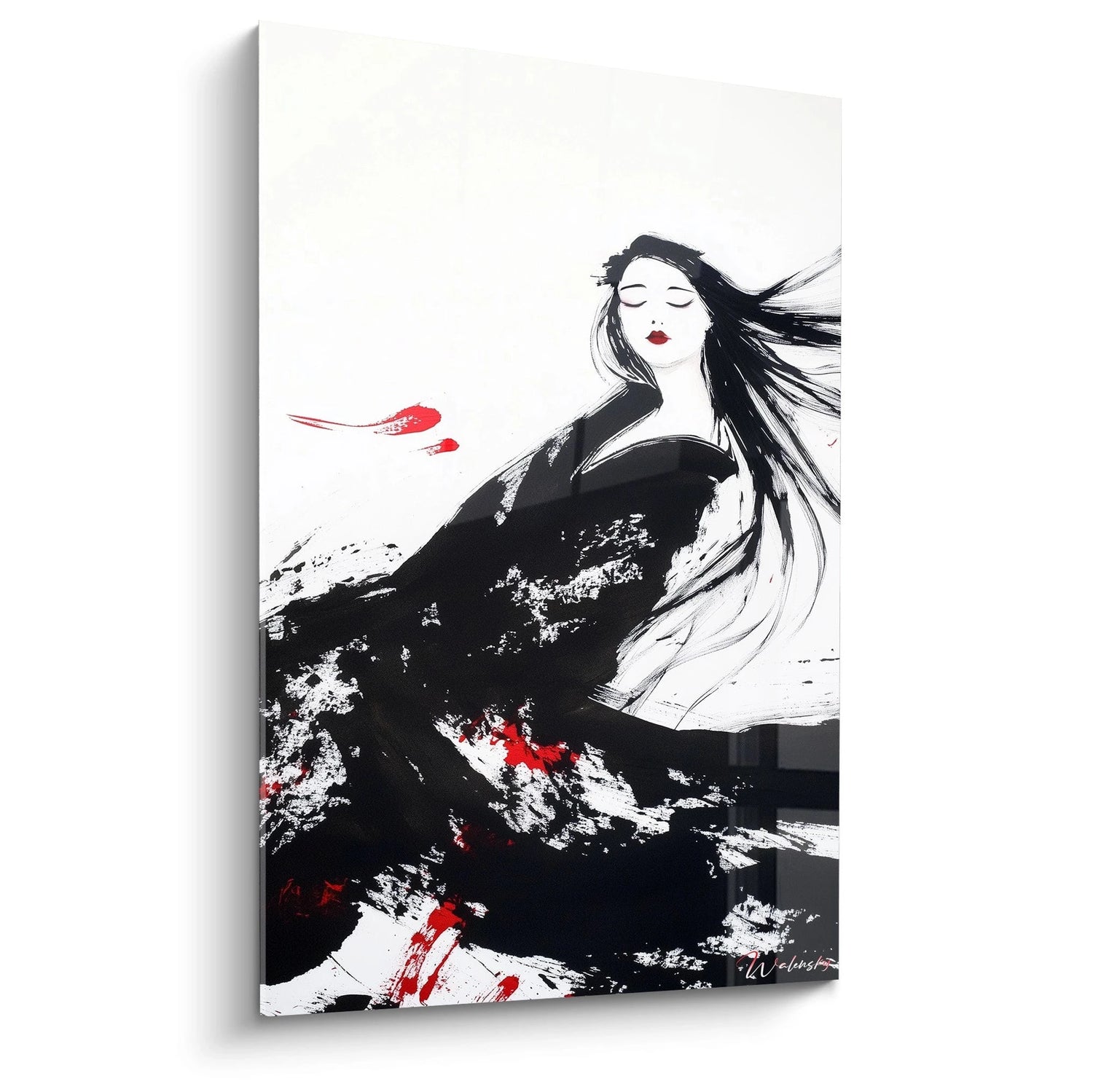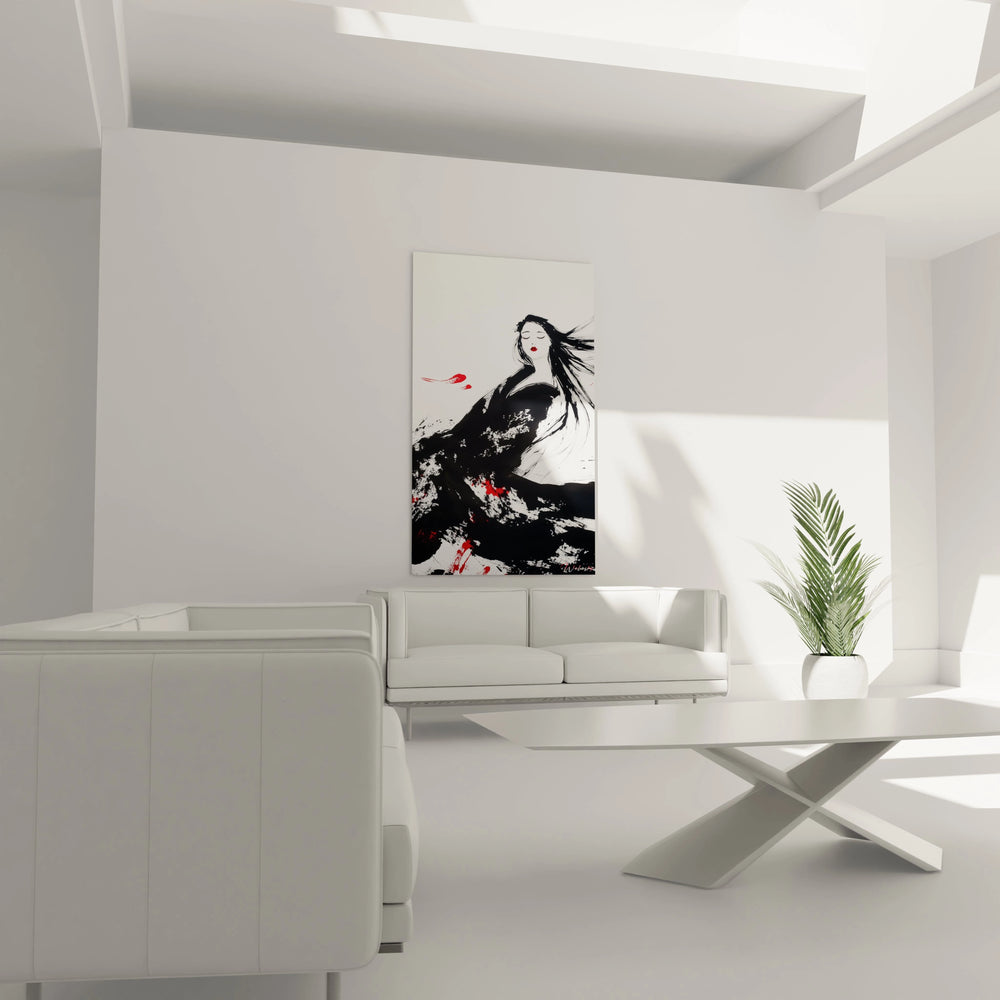 En admirant ce tableau, laissez-vous envelopper par le contraste puissant entre le noir profond et la pureté éclatante du blanc, sublimé par des touches de rouge audacieuses. Ce mariage chromatique évoque une tension élégante et vibrante, capturant la fragilité et la force humaine dans un souffle suspendu entre rêve et réalité.