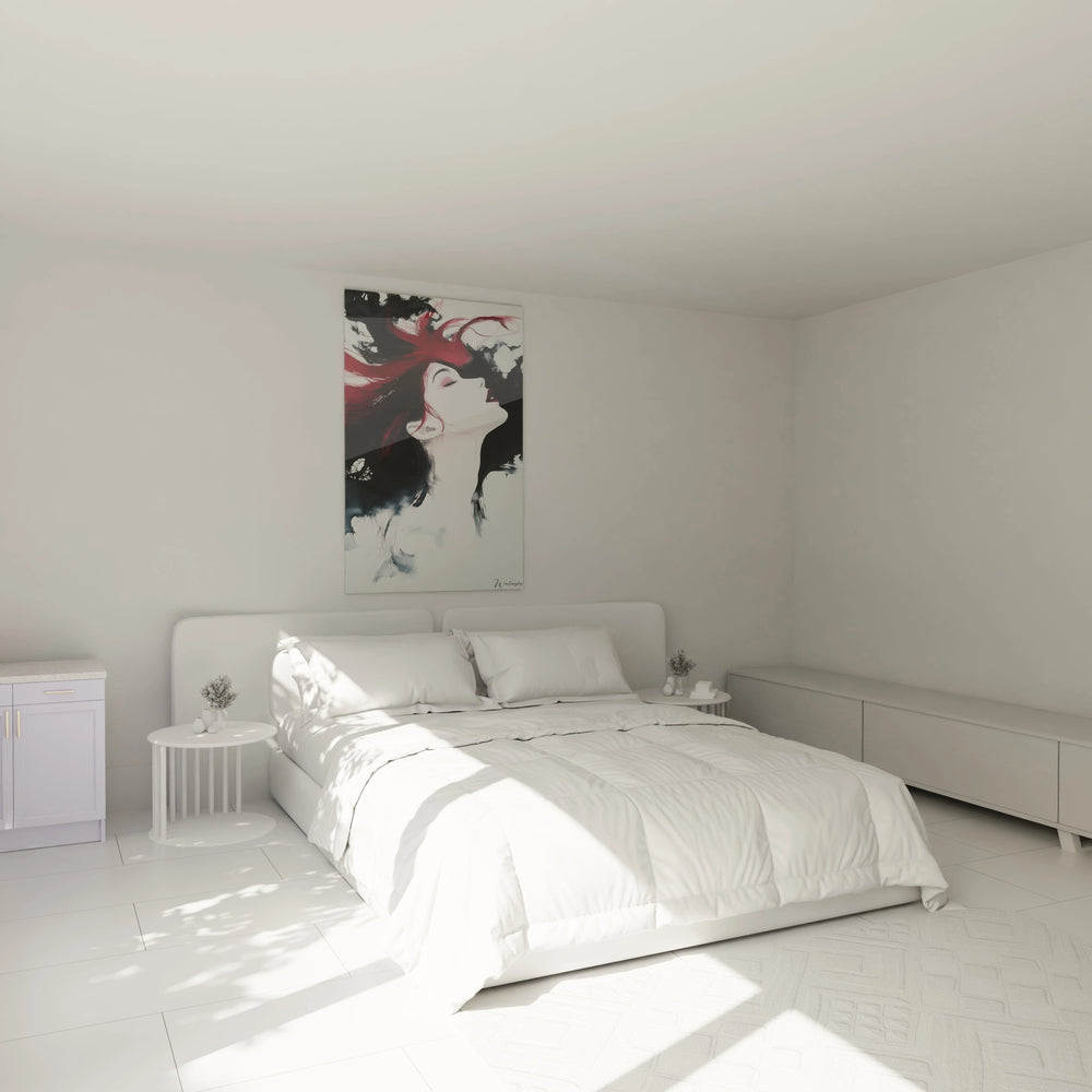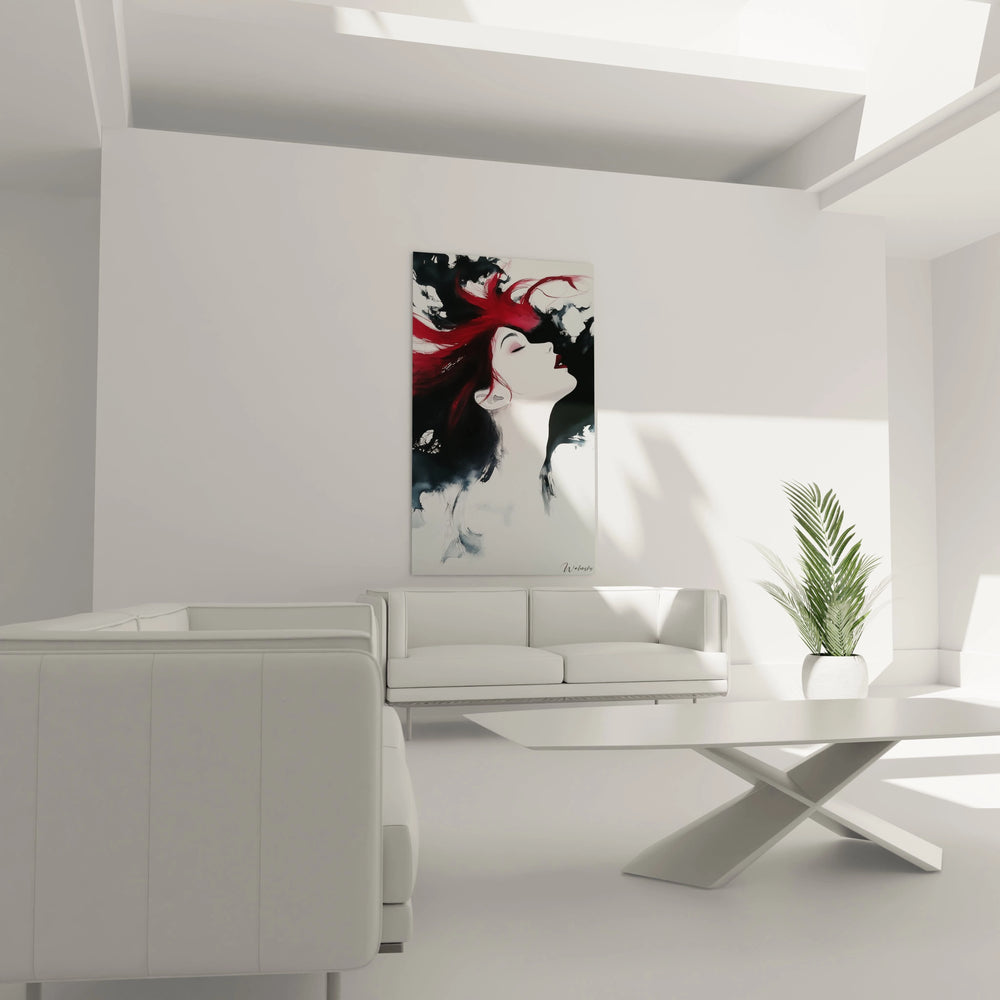 Ce tableau vous invite à plonger dans une atmosphère à la fois dramatique et aérienne, où les noirs profonds et les rouges éclatants dialoguent avec un blanc lumineux, créant un jeu de contrastes puissant et raffiné. La silhouette féminine représentée semble se fondre dans un halo d’ombres mouvantes, comme une apparition qui s’élève doucement hors du réel pour rejoindre un monde de rêve et d’abstraction.