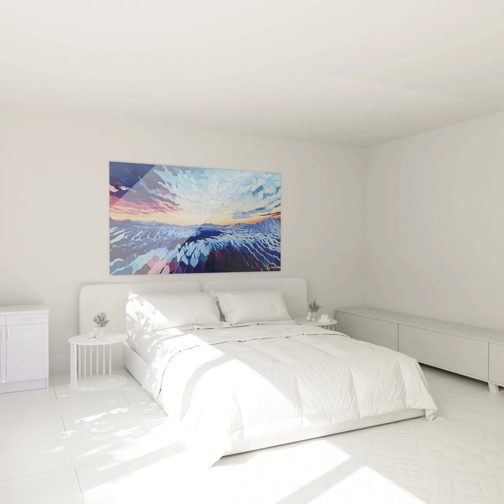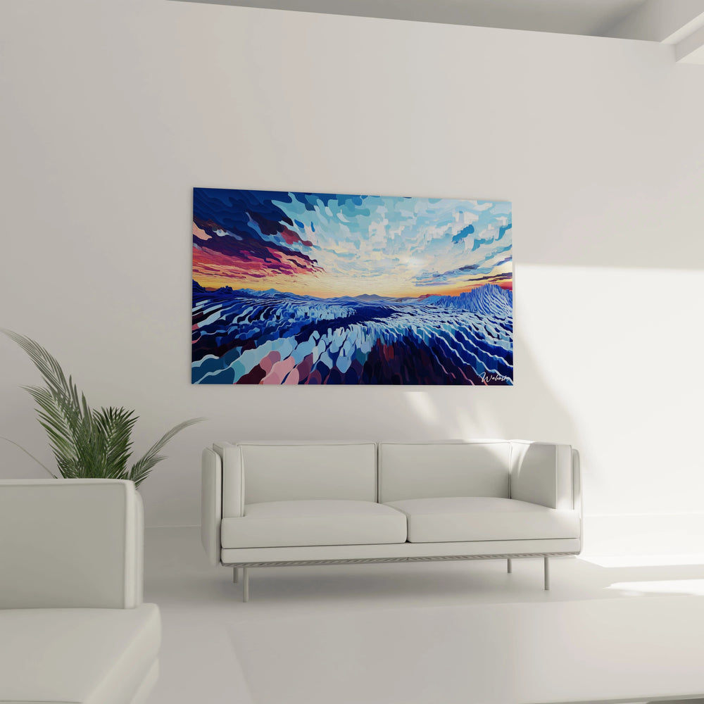Plongez dans une ambiance où la lumière danse sur les reliefs, où la métamorphose des formes crée une sensation de mouvement fluide et harmonieux. Les nuances profondes de bleu se mêlent avec élégance aux éclats lumineux d’orange et de blanc, évoquant la fraîcheur d’un horizon infini rehaussé par des touchers chaleureux et vibrants. Chaque détail de ce tableau suggère un souffle puissant, une respiration naturelle qui emplit votre espace d’une énergie à la fois apaisante et exaltante.