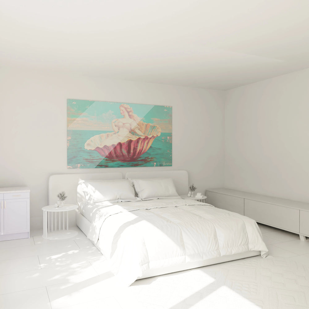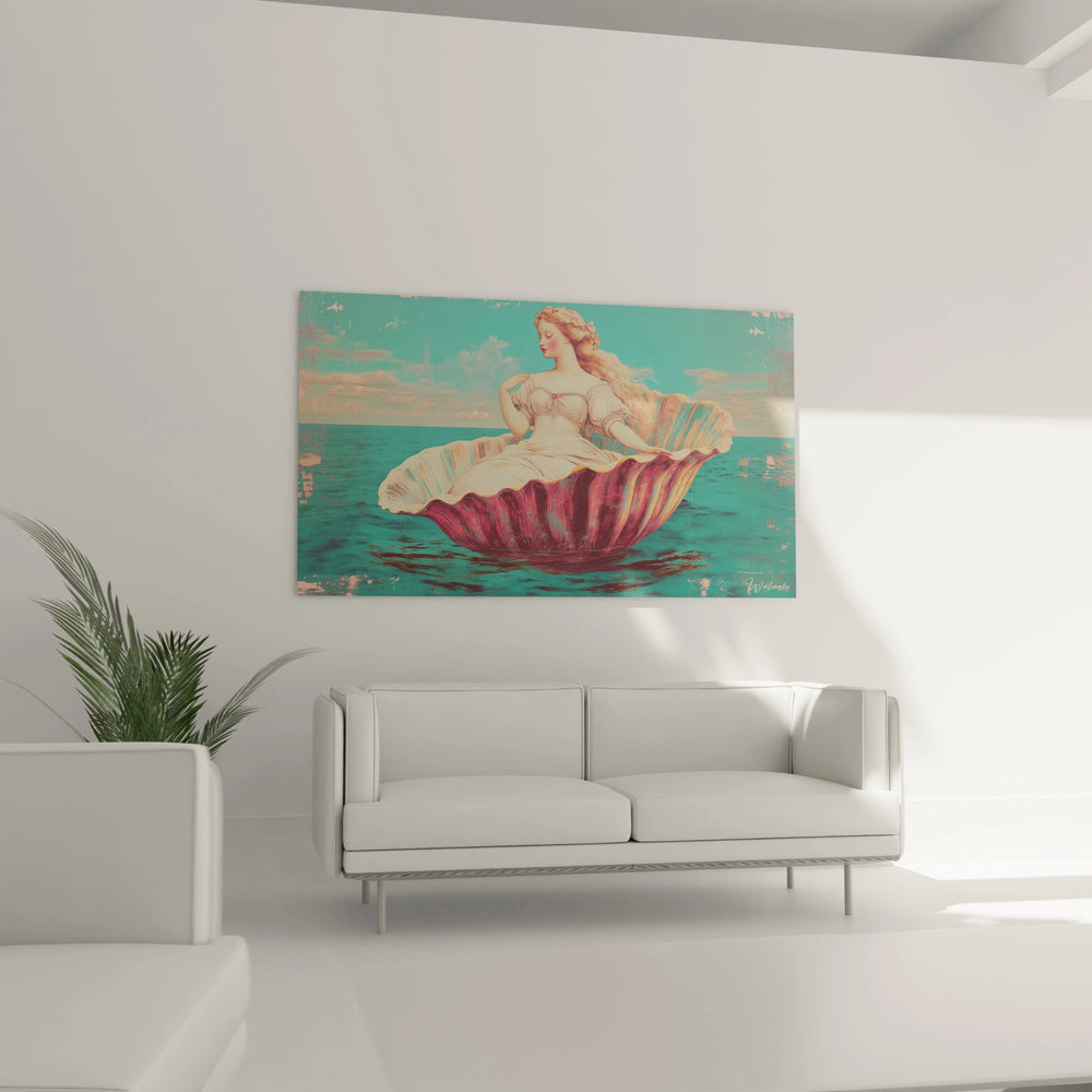 Plongez dans un univers où légende et modernité se rencontrent avec ce magnifique tableau inspiré par La Naissance de Vénus. Ici, la déesse de l’amour renaît sous un jour nouveau, suspendue dans un décor marin à la fois infini et enchanté, créant une atmosphère où passé et présent s’entrelacent avec finesse.