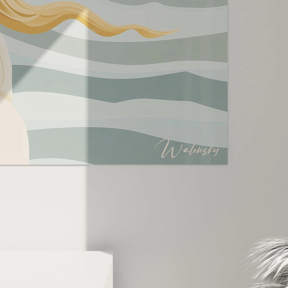 À travers ce tableau, les lignes épurées et les formes délicates dessinent un univers où se mêlent harmonie des éléments et beauté féminine idéalisée. Les nuances soigneusement choisies – un bleu pâle évoquant l’infini du ciel et la douceur des vagues, un beige subtil, et un or léger rehaussant la lumière – composent une symphonie colorée qui enveloppe votre regard et apaise instantanément l’esprit.