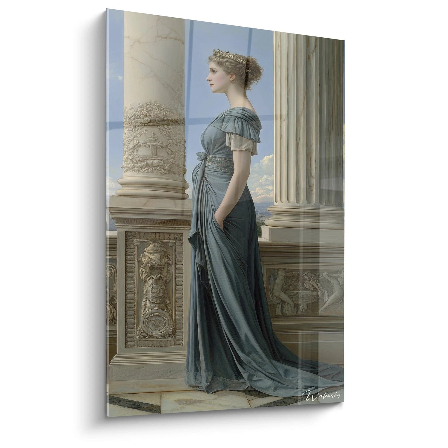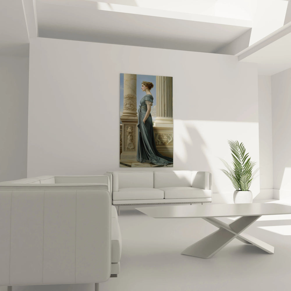 Chaque détail est pensé pour éveiller vos sens : la robe bleue fluide évoque un profond sentiment de calme, tandis que le beige chaud des colonnes instaure une présence rassurante et noble. Les reflets dorés de la couronne apportent une touche précieuse, subtile, presque secrète, qui métamorphose la composition en une ode à la beauté classique. Vous sentirez presque la lumière douce des fins d’après-midi caresser la scène, créant un moment suspendu au temps, où la contemplation devient un luxe accessible.