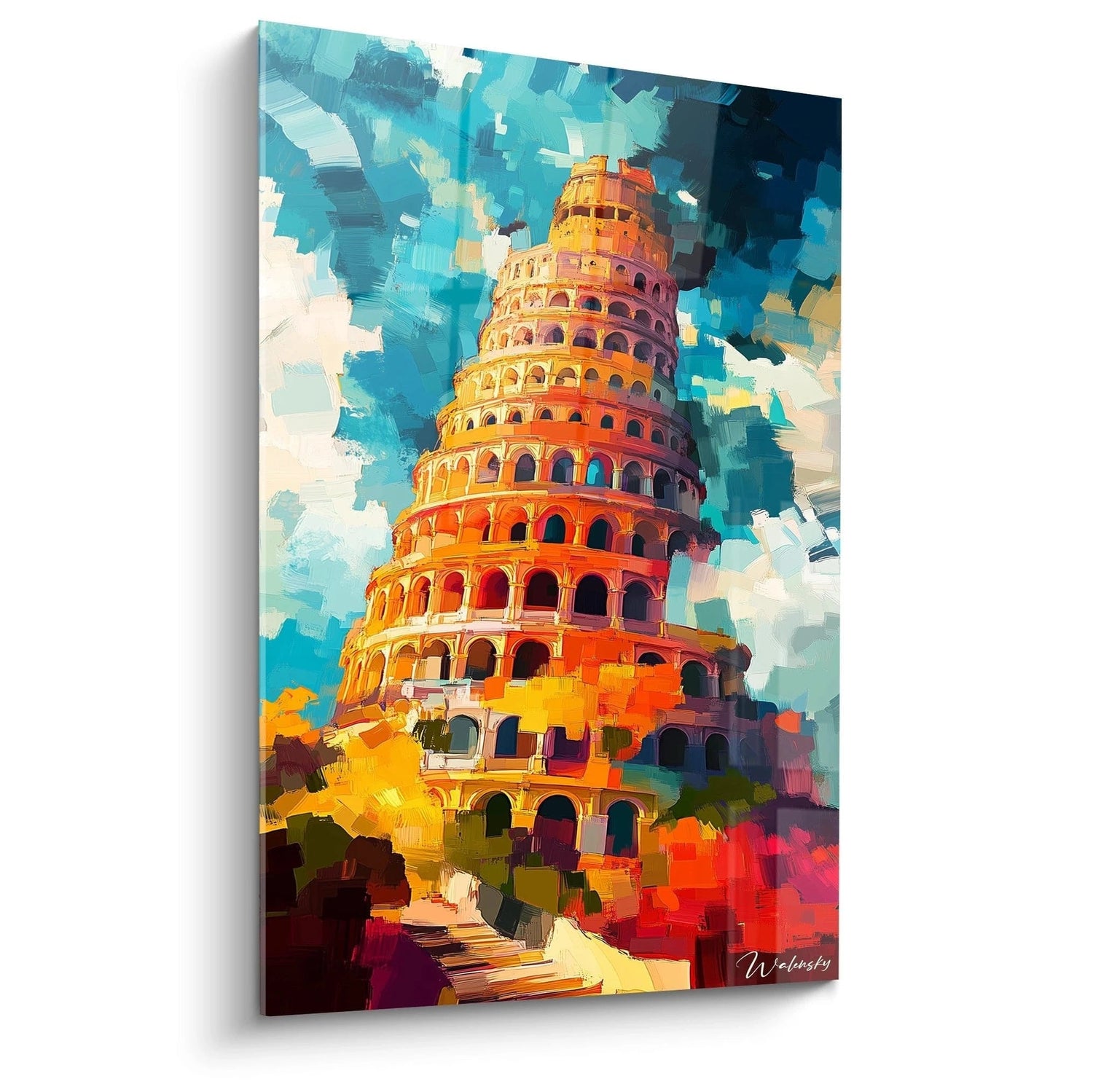 Imaginez une architecture monumentale vibrant d’une énergie nouvelle. Le tableau déploie une composition semi-abstraite où la silhouette imposante de la tour s’élève comme un rêve fragmenté. Les couleurs intenses – orange brûlant, bleu profond et rouge éclatant – embrasent la scène, créant une atmosphère où lumière et matière s’enlacent dans un ballet passionné. Chaque coup de pinceau donne du relief, évoquant la force et la complexité des bâtisseurs d’antan tout en insufflant une dynamique imprévisible à la structure.