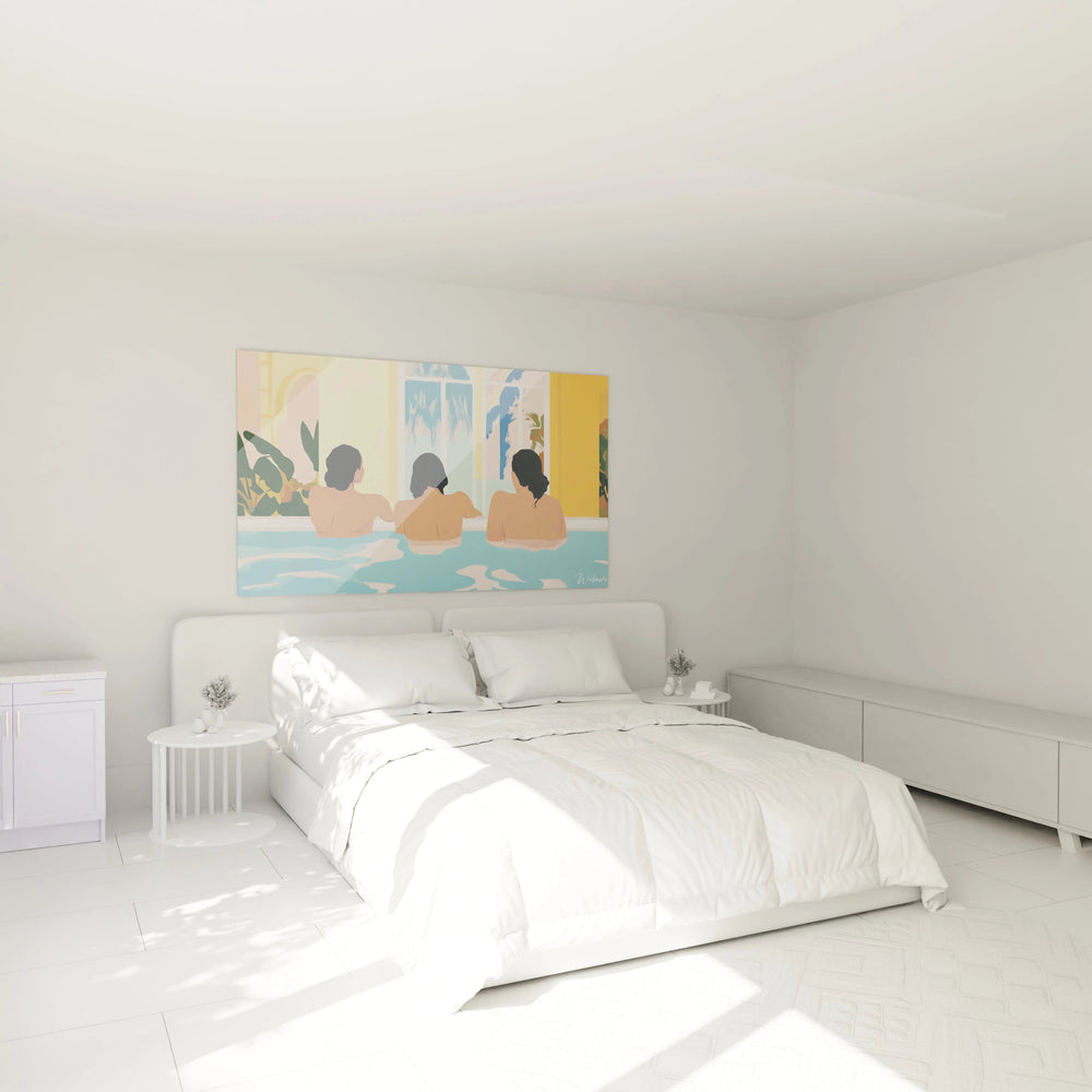 Au cœur de cette composition raffinée, trois silhouettes paisibles se tiennent dans une piscine d’un bleu limpide, tournées vers un horizon tropical baigné de lumière. Cette scène, choisie avec soin, traduit une quête d’harmonie entre votre espace intérieur et l’appel apaisant de la nature. Plus qu’un simple décor, ce tableau évoque un refuge sensoriel où le calme de l’eau épouse la chaleur subtile des jaunes et des verts, capturant la magie d’un moment suspendu.