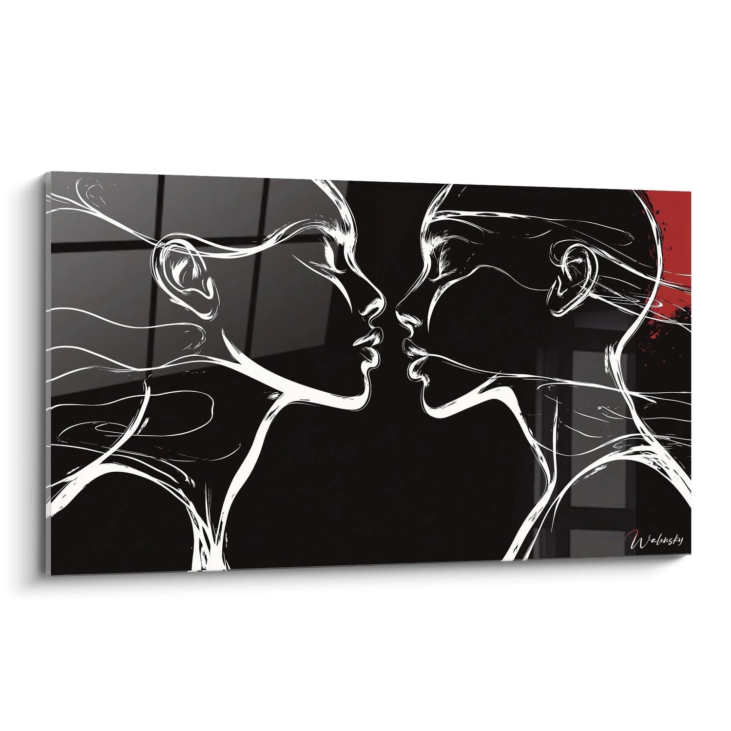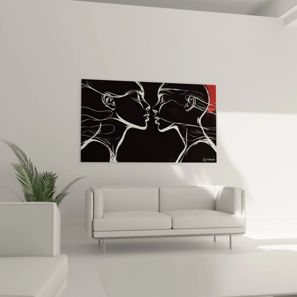 Chaque trait de ce tableau révèle une histoire de rencontre et de reflet, où les formes s’entrelacent en une danse harmonieuse et vibrante. Imaginez ces lignes fluides caressant doucement vos murs, proposant un instant de contemplation suspendu, presque hypnotique. L’intensité du noir profond sert de théâtre à ces silhouettes qui semblent surgir de l’ombre, tandis que les touches subtiles de rouge éveillent vos sens et captivent le regard.