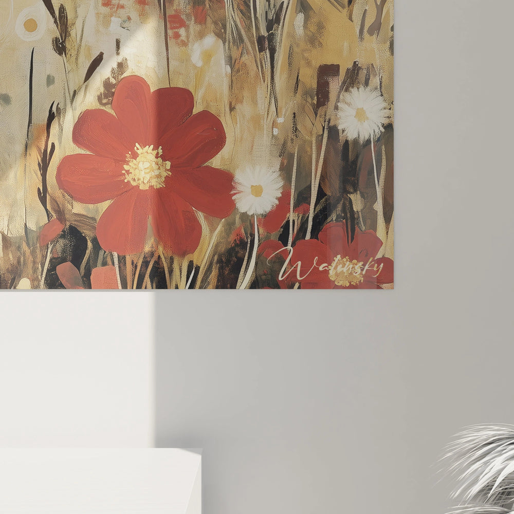 Dans ce tableau, chaque détail est une caresse pour les yeux : les motifs floraux invitent à la rêverie tandis que les spirales dorées scintillent comme un fil invisible reliant deux âmes. La profondeur des noirs contraste magnifiquement avec les éclats d’or et le rouge chaleureux, créant un jeu de lumière qui attire et captive. Ainsi, la pièce ne se contente pas de décorer, elle raconte une histoire, celle d’une passion fragile et éternelle.
