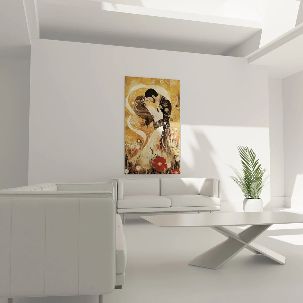 Imaginez un instant capturé dans l’éternité, où l’amour se mêle à la beauté pure de la nature, sublimé par une lumière dorée. Ce tableau inspiré par Le Baiser de Gustav Klimt est bien plus qu’une simple œuvre d’art : c’est une invitation à ressentir la tendresse la plus délicate et la magie d’un lien unique. Pensé pour transformer votre intérieur, il offre à votre espace une atmosphère à la fois intime et élégante, enveloppée dans des teintes riches et vibrantes.