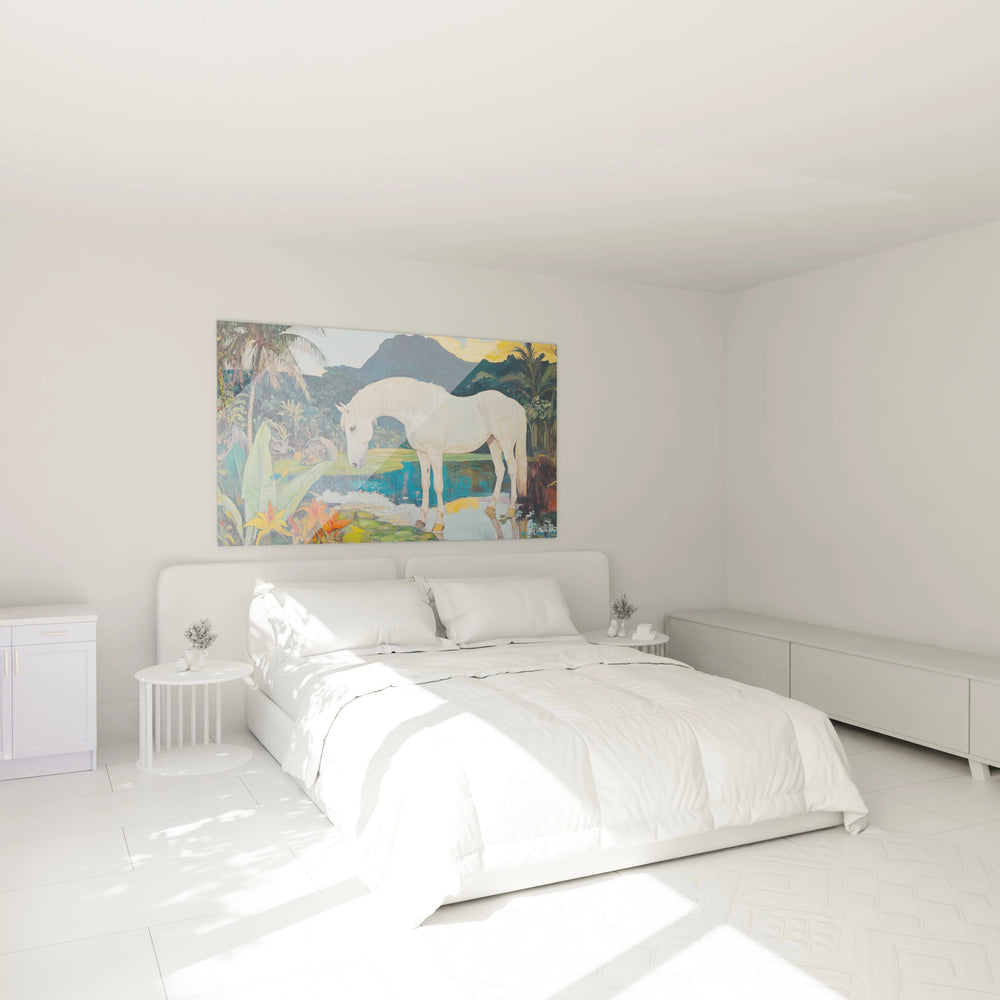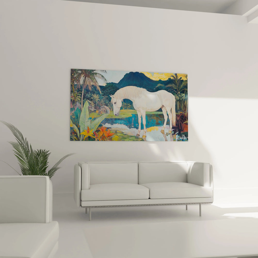 Imaginez un instant plonger dans un univers où la nature s'exprime avec grâce et élégance, où chaque détail respire la paix et la liberté. Ce tableau, inspiré par l’univers luxuriant de Paul Gauguin, vous transporte au cœur d’un paysage tropical où la lumière danse sur l’eau cristalline et où un cheval blanc majestueux incarne la pureté et le rêve.