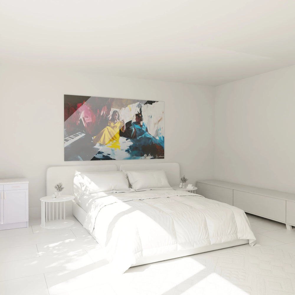 Plongez dans une ambiance raffinĂ©e et mystĂ©rieuse avec ce tableau unique, qui ravive lâesprit du cĂ©lĂšbre Concert de Johannes Vermeer Ă travers une interprĂ©tation moderne et vibrante. ImaginĂ©e comme une scĂšne suspendue dans le temps, cette Ćuvre Ă©voque un dialogue silencieux entre deux femmes enveloppĂ©es de couleurs riches et profondes, oĂč chaque dĂ©tail est pensĂ© pour Ă©veiller vos sens et embellir votre intĂ©rieur avec une Ă©lĂ©gance intemporelle.