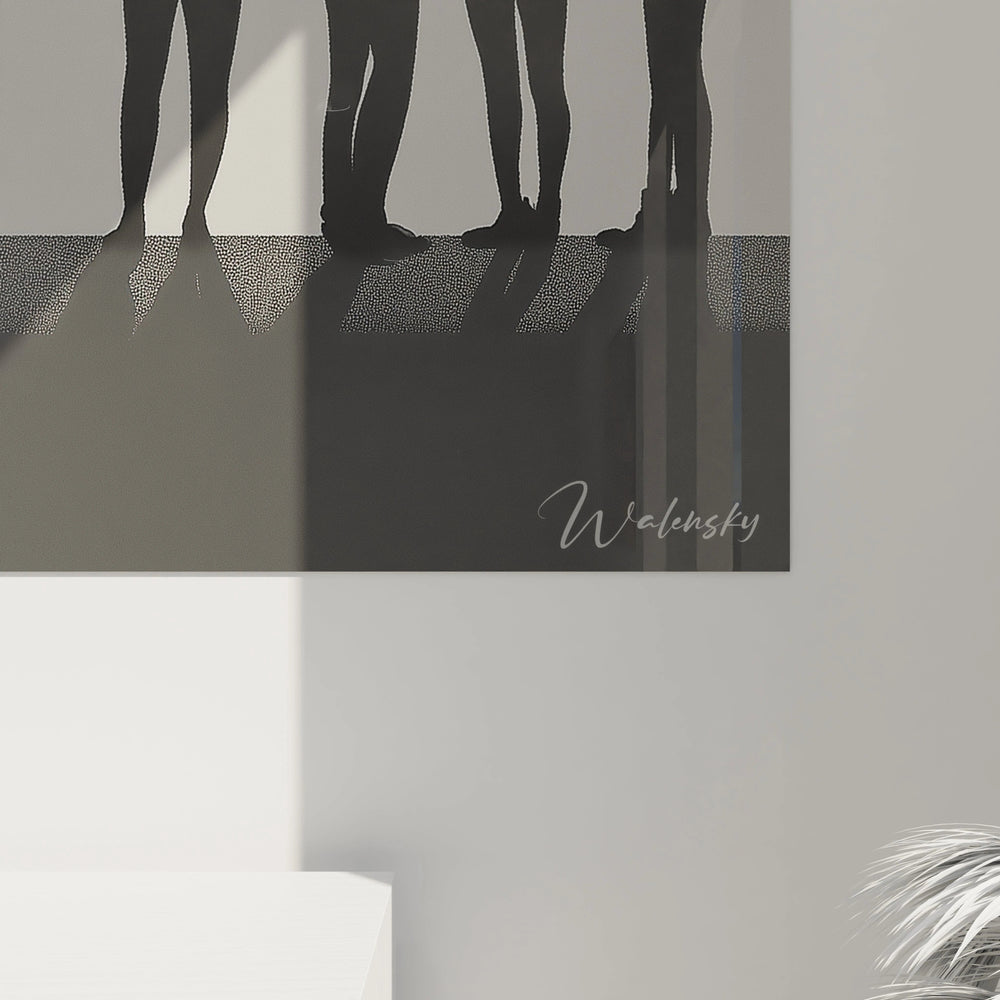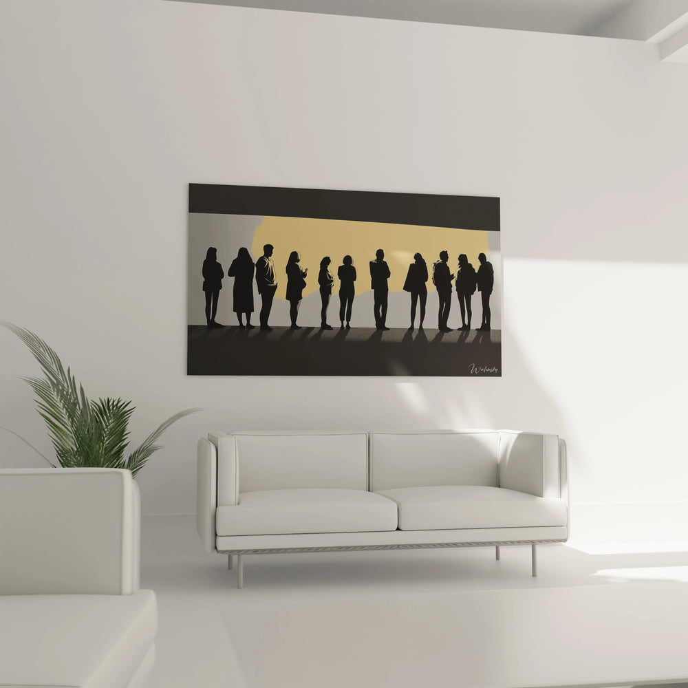 Ce tableau se distingue par son jeu subtil de silhouettes noires en position d’attente, alignées avec une précision graphique. Chaque forme, dépouillée de tout détail superflu, incarne l’universalité et l’anonymat, créant un sentiment à la fois d’introspection et d’harmonie collective. L’arrière-plan, composé de dégradés apaisants de beige et de gris, évoque une lumière douce qui enveloppe ces figures, suggérant une ambiance à la fois paisible et intrigante.