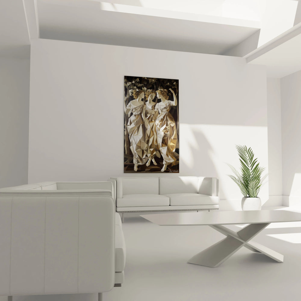 Imaginez trois figures féminines délicatement fragmentées, comme capturées dans une danse suspendue. Chaque facette du tableau reflète la lumière avec subtilité, créant un jeu visuel qui capte l’œil et invite à la contemplation. Les nuances harmonieuses de beige, marron et blanc confèrent à cette œuvre une profondeur chaleureuse et une élégance discrète, parfaite pour enrichir un espace de vie ou de travail.