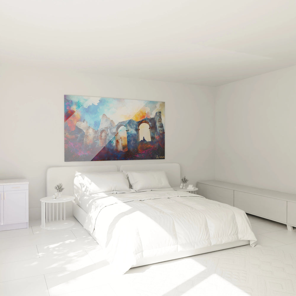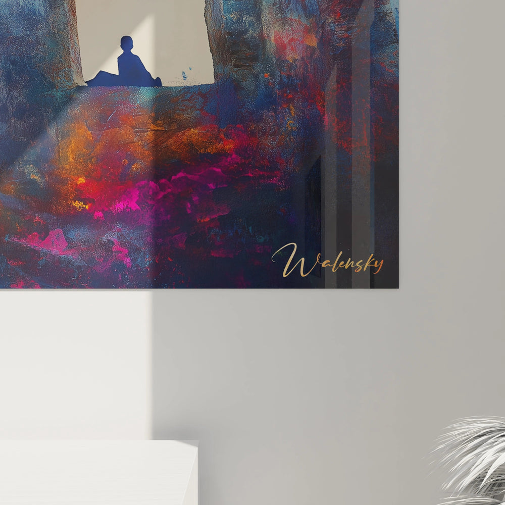Au cœur de ce tableau, une silhouette solitaire vous invite à partager un moment d’introspection et de calme absolu. Cette présence discrète, face à l’immensité céleste et aux vestiges du passé, incarne la quête permanente de sens et la contemplation silencieuse de l’infini. Ressentez cette tension poétique entre la fragilité des constructions humaines et la majesté immuable de la nature qui vous enveloppe.