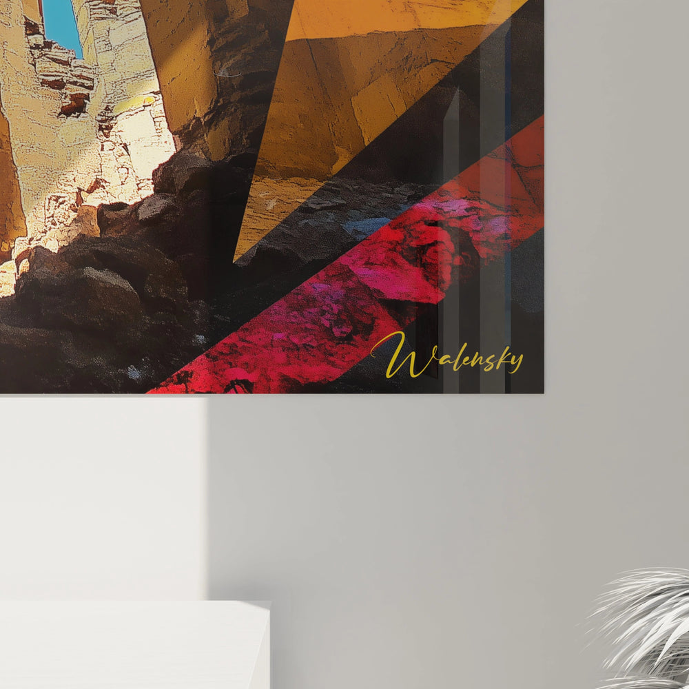 Imaginez-vous face à d'imposantes ruines baignées d’une lumière éclatante, un espace où le poids du temps s’incarne pleinement. La silhouette solitaire, discrète, vous emmène dans une méditation profonde sur la fragilité des civilisations et la permanence de l’art. À ce décor antique, s’ajoutent des éléments géométriques vibrants, aux couleurs franches et incisives — jaune éclatant, rouge intense et noir profond — qui insufflent une énergie contemporaine et dynamique à la scène.