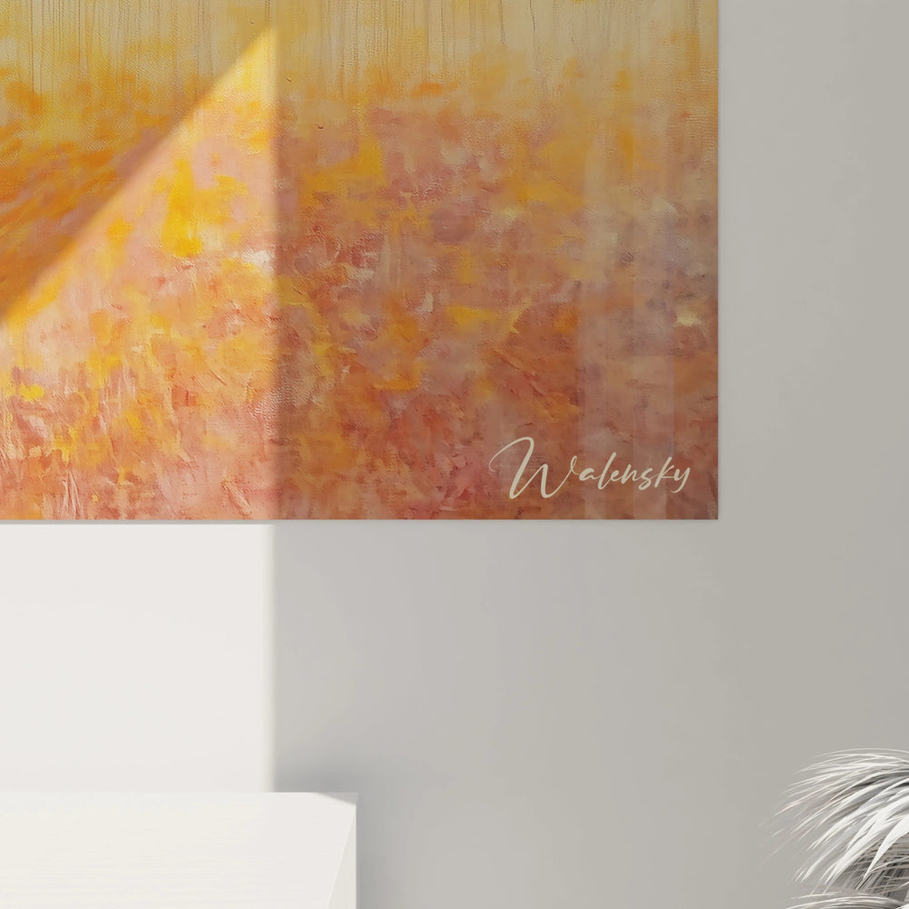 Les nuances chatoyantes d’orange, de beige et de bleu s’entrelacent pour envelopper votre pièce d’une douce luminosité. La texture fluide de la scène capte la lumière comme un voile délicat, évoquant la transition entre le jour naissant et la nuit tombante. Ce jeu subtil entre chaleur et fraîcheur crée un équilibre visuel apaisant qui transforme votre intérieur en un refuge de sérénité et d’évasion.