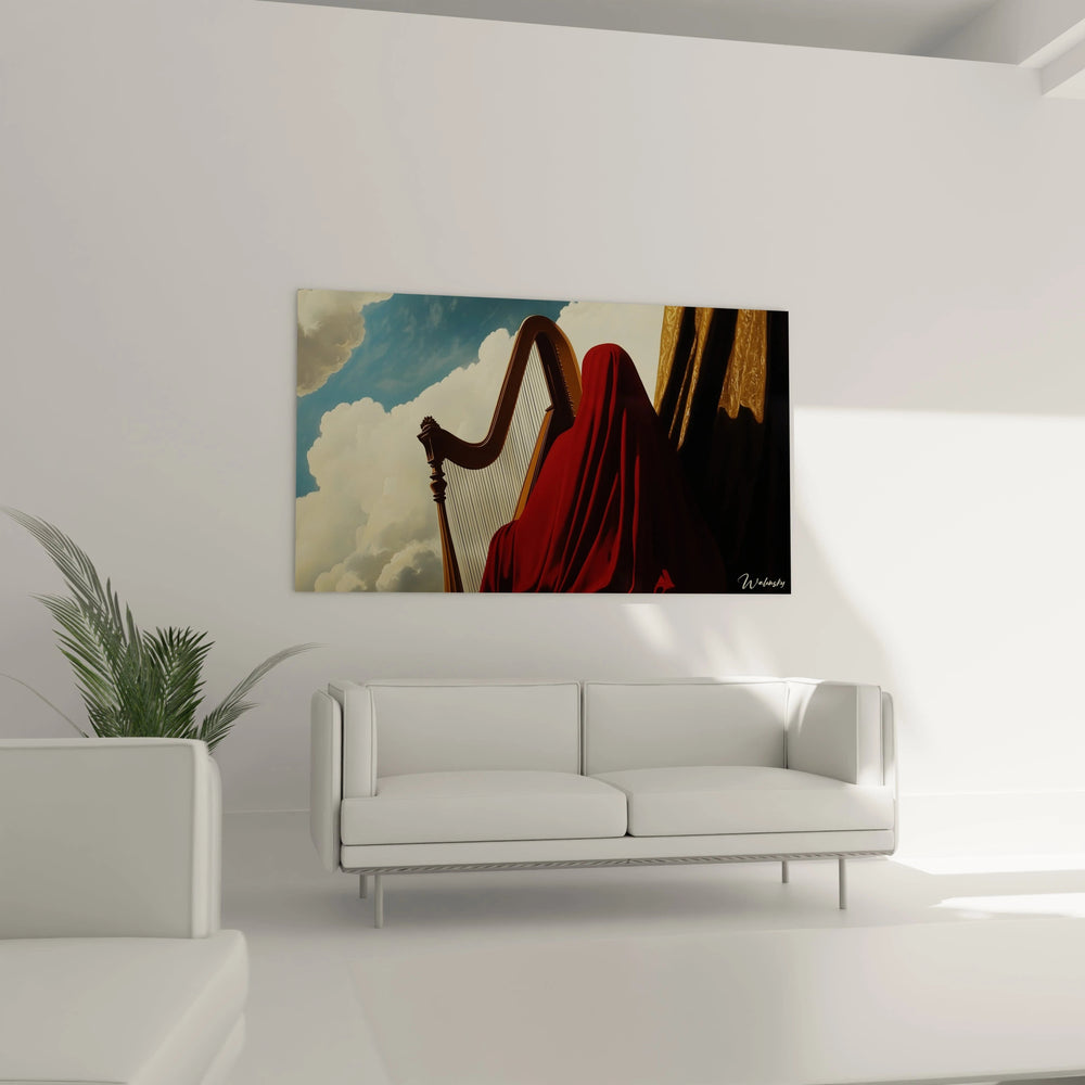 Au cœur de cette composition, la harpe, drapée d’un rouge vibrant, devient le protagoniste d’un récit secret. Sous ce voile, elle incarne le mystère de ce qui demeure caché, un murmure suspendu entre le visible et l’imaginaire. Le contraste saisissant avec le ciel bleu parsemé de nuages légers ajoute une profondeur infinie, rappelant l’équilibre fragile entre légèreté et intensité. Chaque pli des tissus, chaque reflet doré des rideaux s’offre à votre regard avec la précision et la délicatesse d’un artisan attentif au moindre détail.
