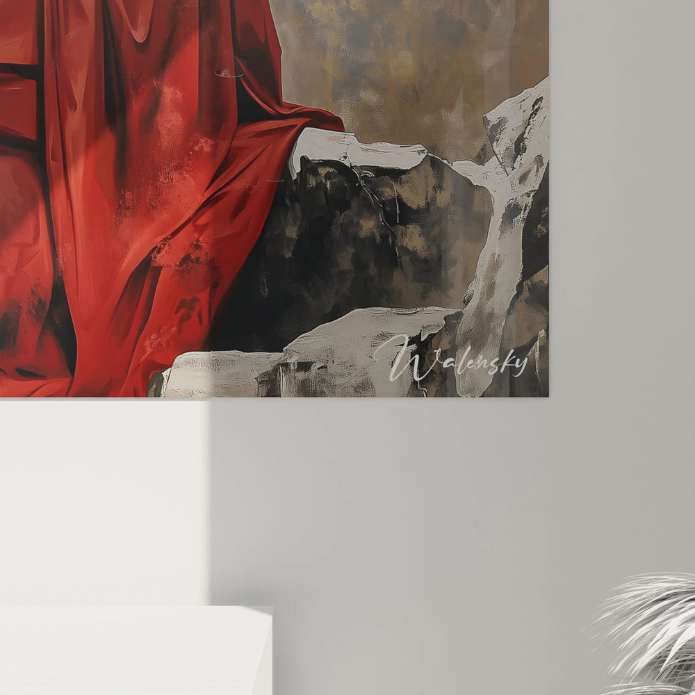 Imaginez un instant, ce personnage solitaire vêtu d’une tunique rouge profonde, plongé dans une contemplation silencieuse sous un ciel doré mystique. Chaque regard posé sur cette scène réveille en vous une sensation d'apaisement mêlée à une profonde réflexion sur la dualité de l’existence : la force et la fragilité, la terre et le divin, le tangible et le spirituel.