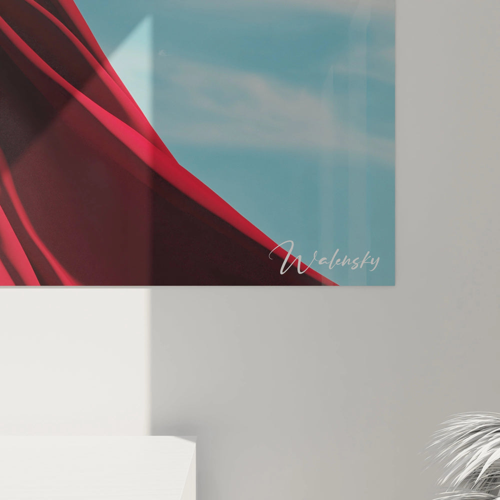 Ce tableau capture lâessence dâune silhouette Ă©nigmatique, dont le visage demeure cachĂ©, Ă©veillant une curiositĂ© presque hypnotique. Le personnage, immobile mais vivant, se dĂ©tache sur un ciel dâun bleu intense, Ă©voquant Ă la fois lâinfini et la tranquillitĂ©. Un drapĂ© rouge, dâune fluiditĂ© saisissante, glisse dĂ©licatement sur lâĂ©paule de la figure, apportant une dimension vibrante et chaleureuse Ă lâensemble. Ce jeu subtil entre la rigiditĂ© du costume noir et la douceur du tissu rouge crĂ©e un contraste magnĂ©tique qui enrichit chaque regard.