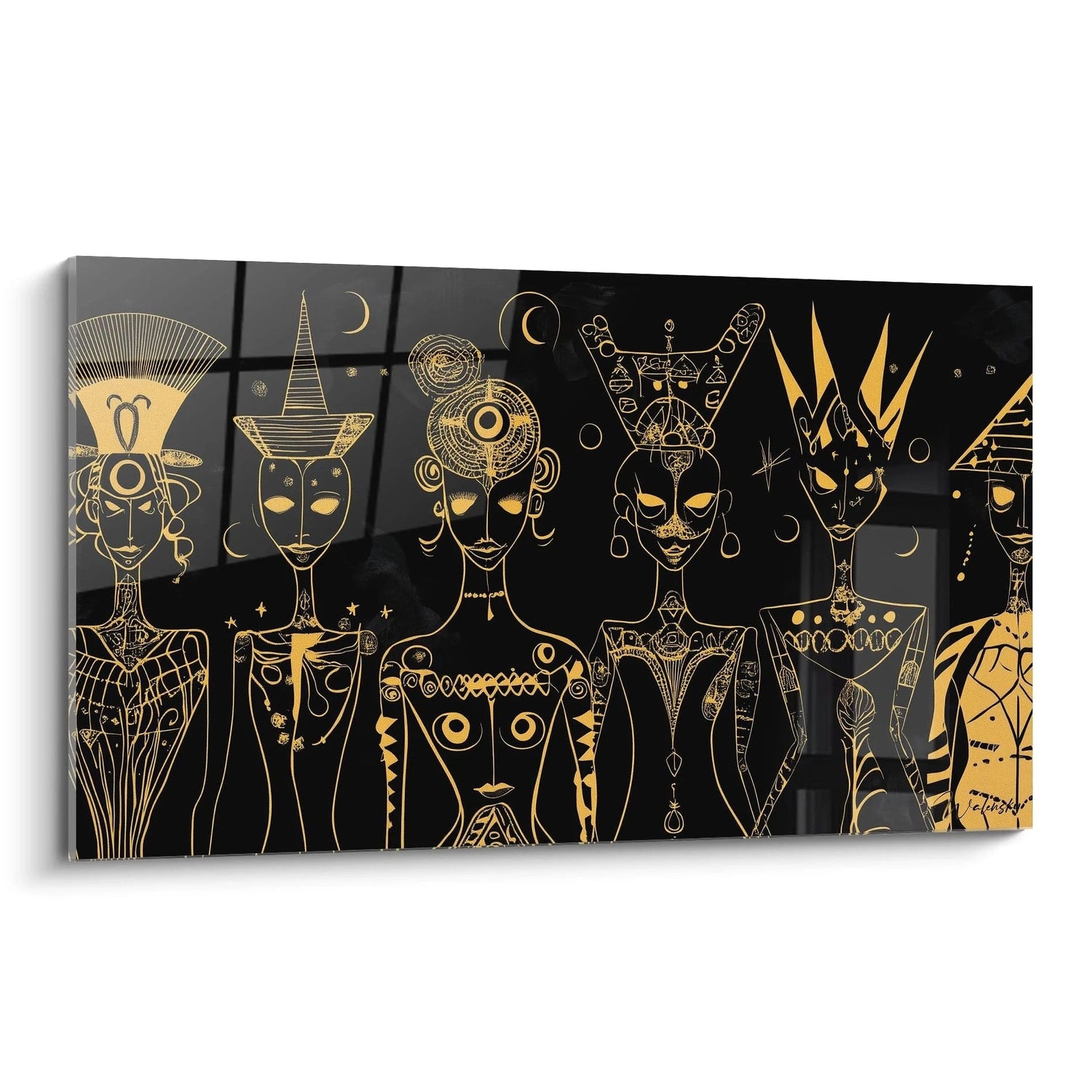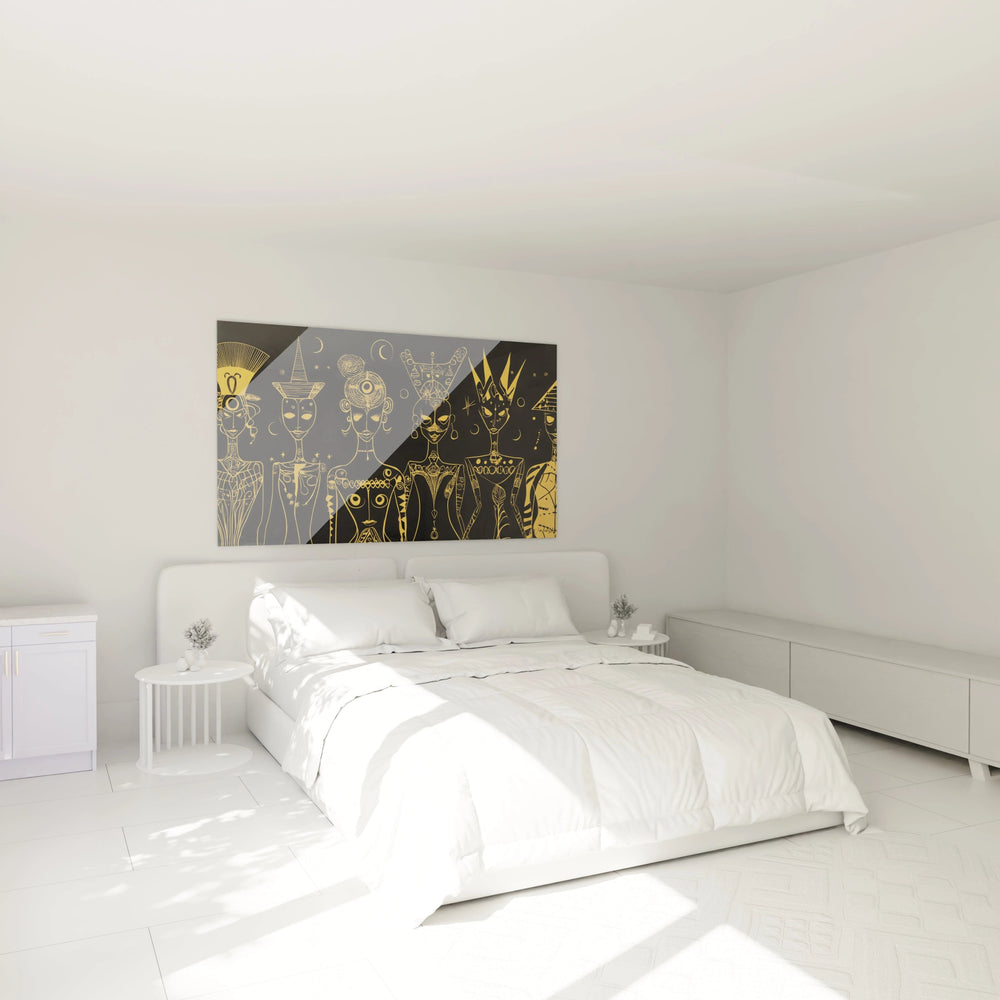 Cette création élève votre intérieur en lui offrant une ambiance à la fois solennelle et envoûtante. Les figures célestes, ornées de motifs lunaires et géométriques, captivent votre regard par leur intensité et leur aura hypnotique. Chacune d’elles représente un archétype universel, un pont entre civilisations anciennes et imaginaires futuristes, traité avec une esthétique pure et graphique.