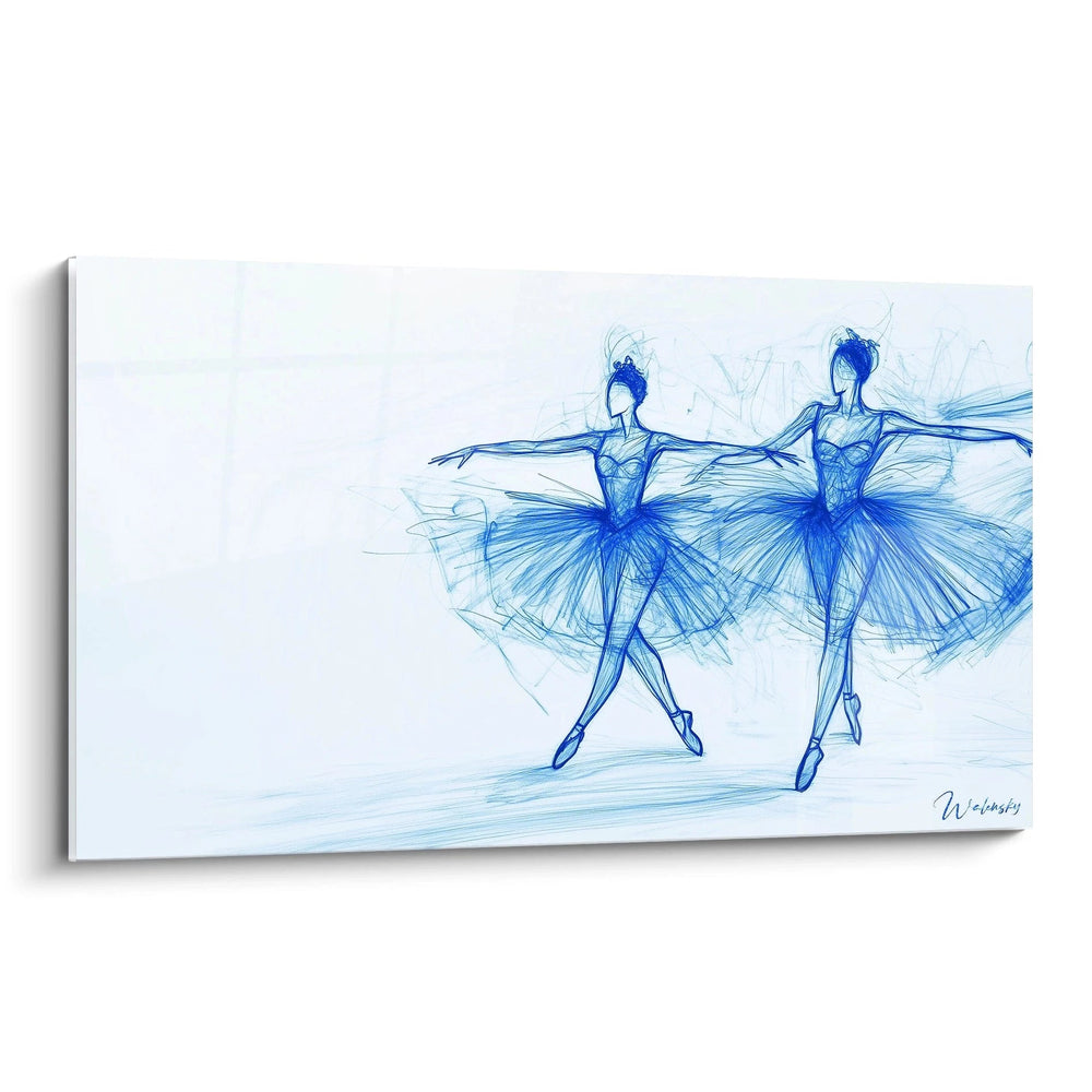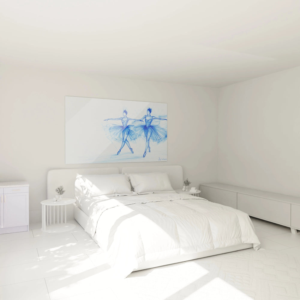 Les silhouettes bleutées, dessinées avec des traits subtils et rapides, donnent l’impression que les danseuses flottent dans une douce atmosphère suspendue. La palette de bleus éthérés, associée à des nuances blanches et grises, crée un équilibre parfait entre sérénité et profondeur. Ce tableau ne se contente pas de décorer, il insuffle une ambiance apaisante et vibrante, où le regard se perd dans la pureté du geste.