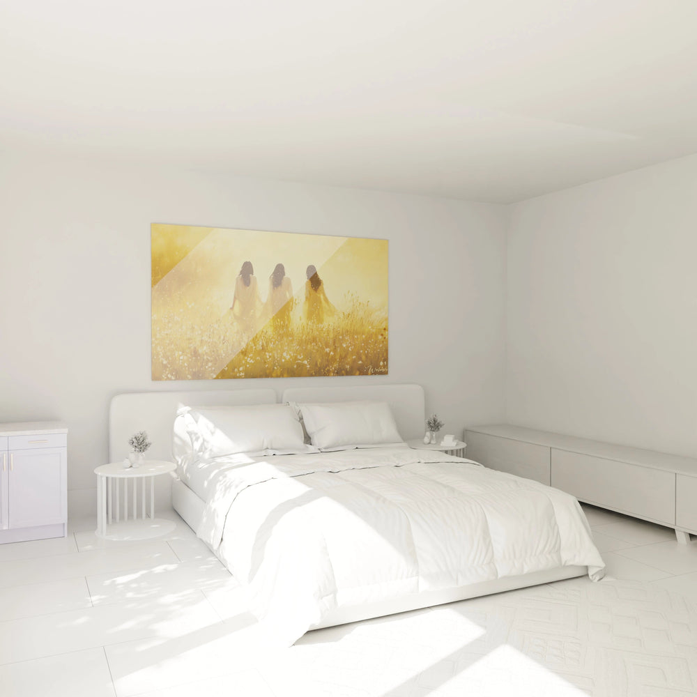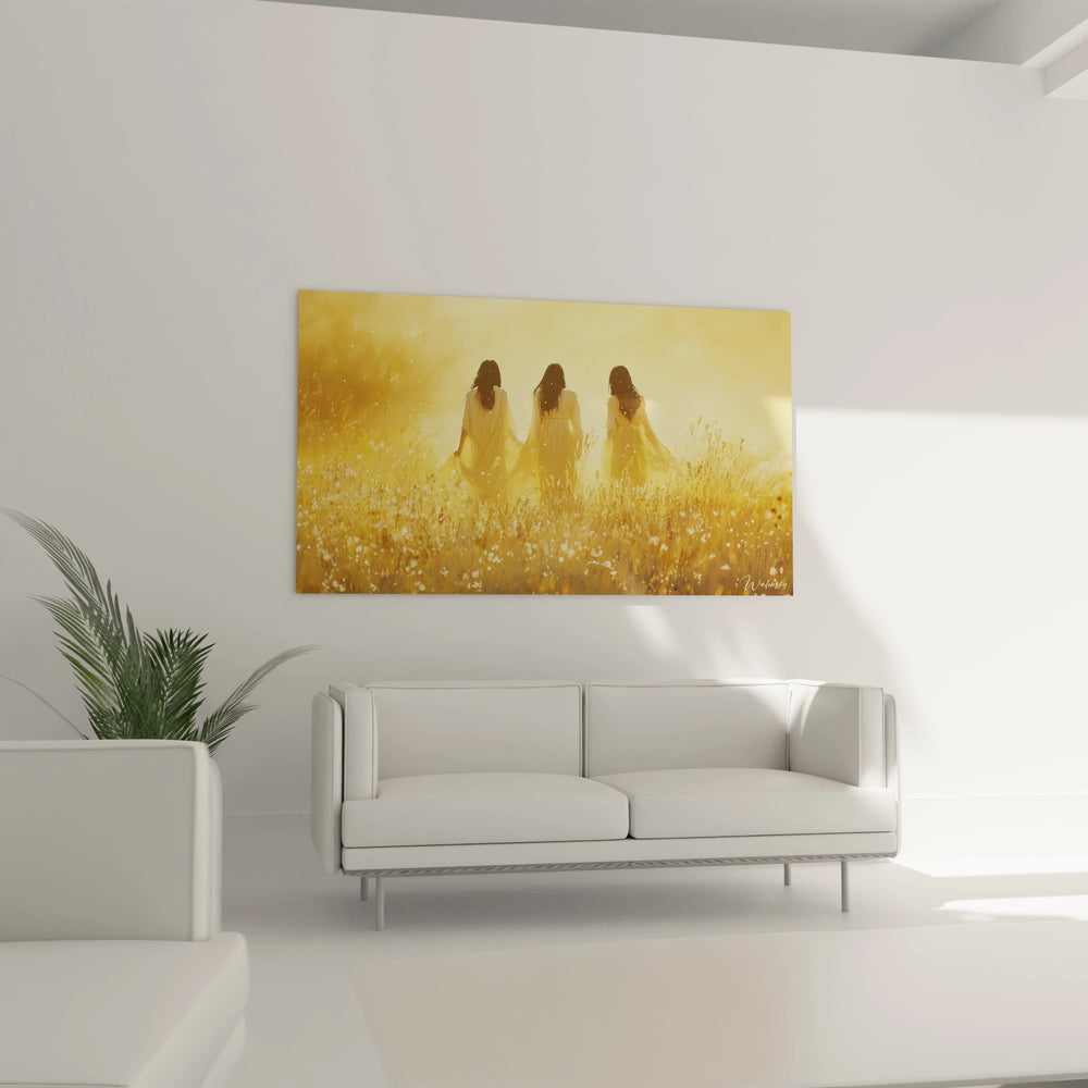 Imaginez la caresse du vent sur les herbes hautes, la chaleur apaisante d’un soleil couchant qui enveloppe chaque détail d’une aura sereine. Ce tableau capture cette sensation d’harmonie parfaite entre le mouvement délicat des robes, presque légères, et l’immobilité douce du paysage. L’effet visuel vous transporte dans une rêverie où le temps semble s’arrêter, invitant à la contemplation et à la quiétude.