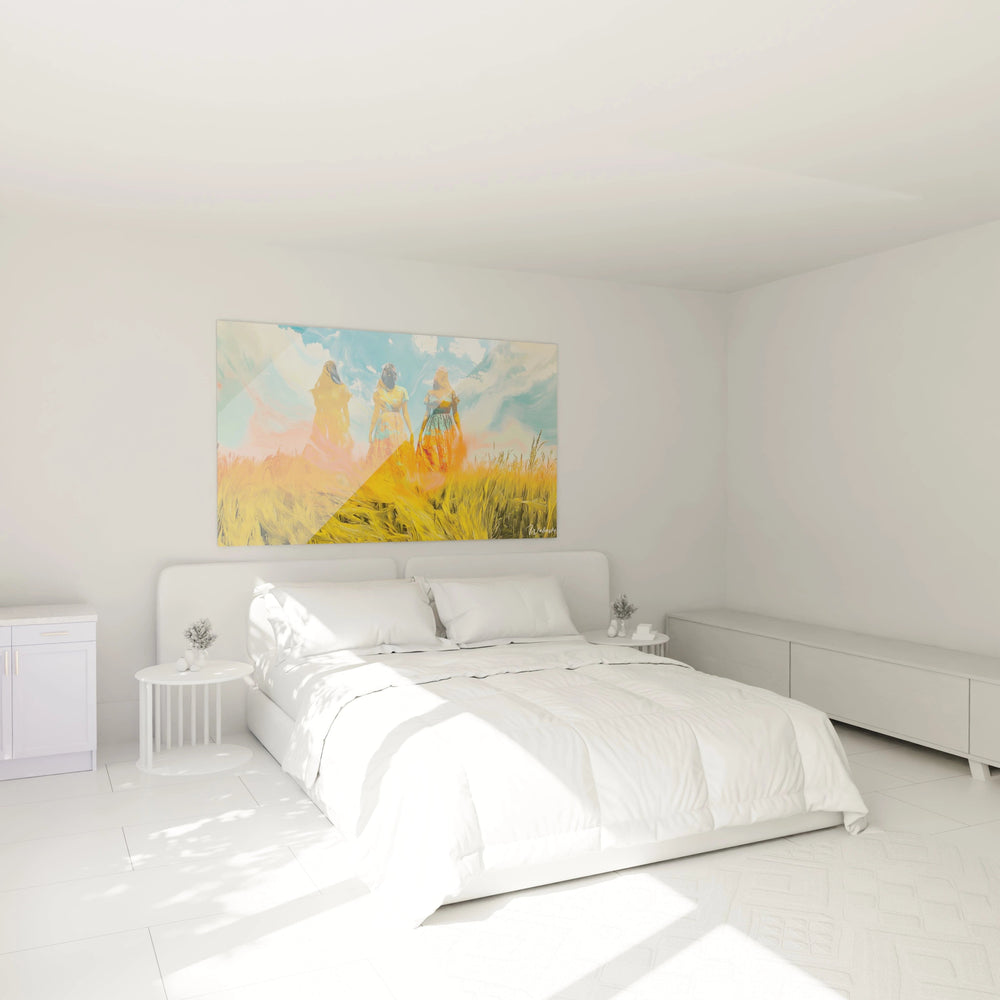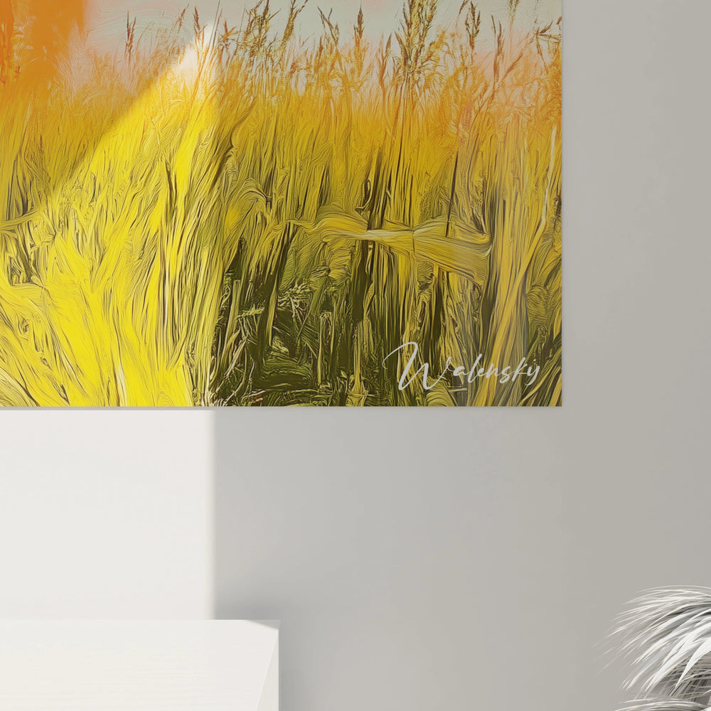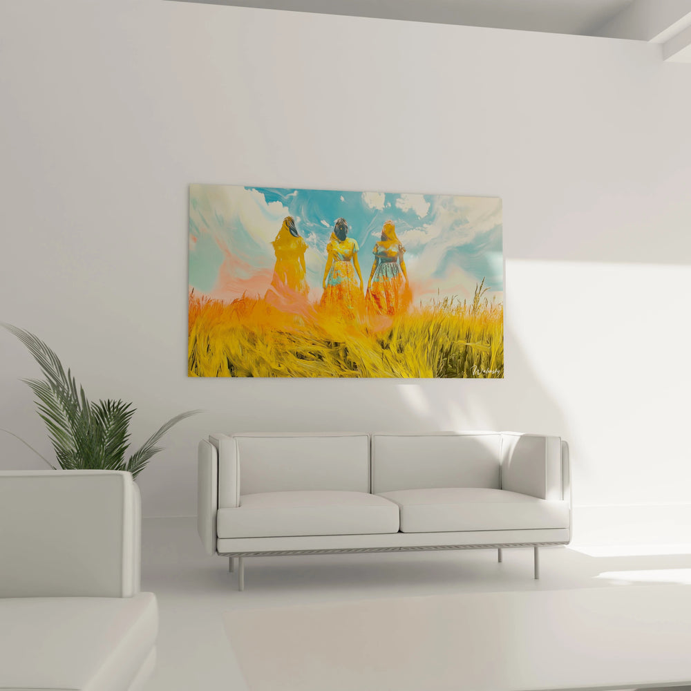 Imaginez un champ doré caressé par une brise légère, sous un ciel d’un bleu éclatant. Ce tableau invite à plonger dans cette atmosphère sereine et chaleureuse, où chaque figure semble flotter, oscillant avec le mouvement du blé. Plus qu’une simple représentation, c’est un hommage à l’équilibre fragile entre la nature et l’humanité, un souffle poétique qui habite votre intérieur et stimule votre sensibilité.