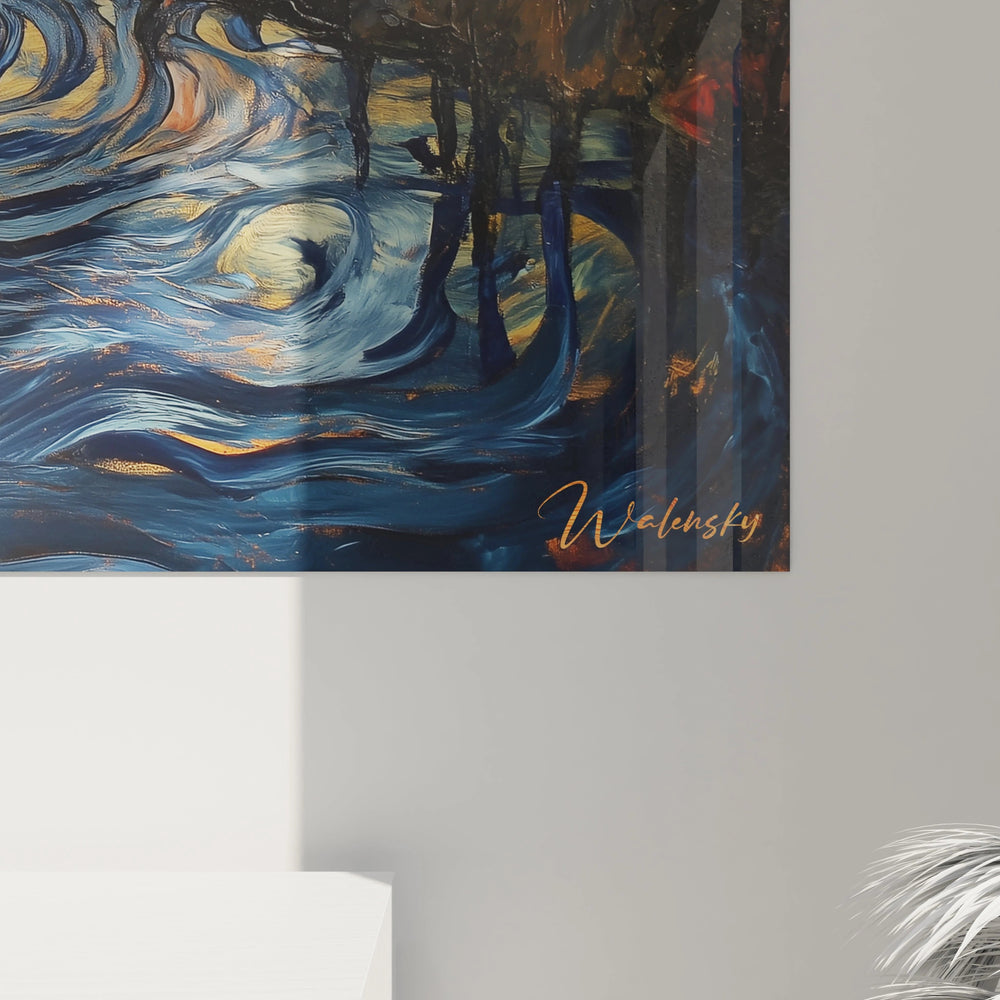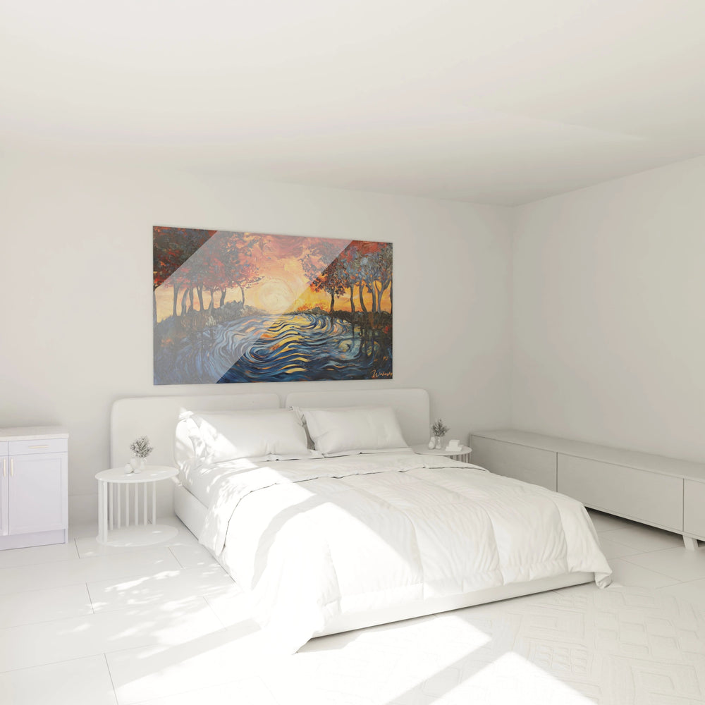 Imaginez-vous face à ce tableau, où les nuances profondes de bleu se mêlent aux éclats orangés du ciel crépusculaire. La scène, à la fois apaisante et vibrante, joue avec la lumière pour créer un dialogue subtil entre l’eau et le ciel. Les silhouettes des arbres élancés encadrent cette étendue, faisant naître une atmosphère à la fois sereine et puissante. Laissez-vous transporter dans cet univers où chaque détail, chaque texture, semble en mouvement permanent, offrant un sentiment d’évasion hors du temps.