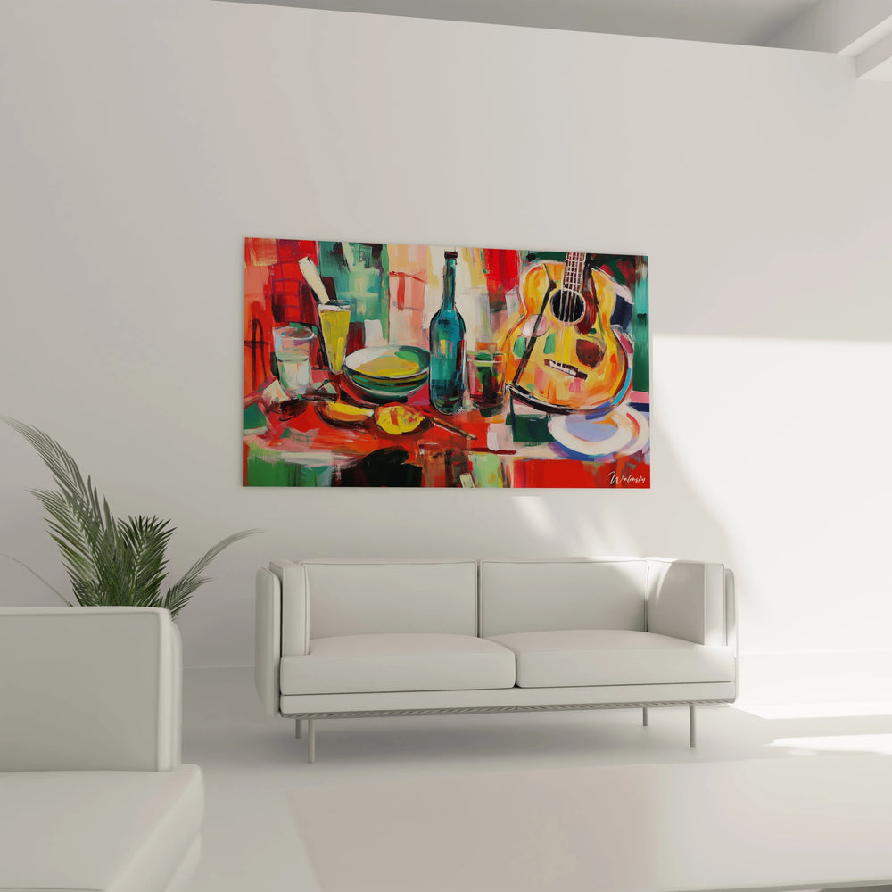 Les couleurs de ce tableau ont été choisies pour envelopper votre espace d’une chaleur vibrante et luxueuse. Le rouge incandescent du fond suggère l’effervescence d’une soirée animée, tandis que le jaune intense de la guitare attire l’œil et illumine la composition. Des touches de vert profond apportent une richesse naturelle, équilibrée par des éclats de bleu et de blanc qui donnent un souffle de fraîcheur et de structure.