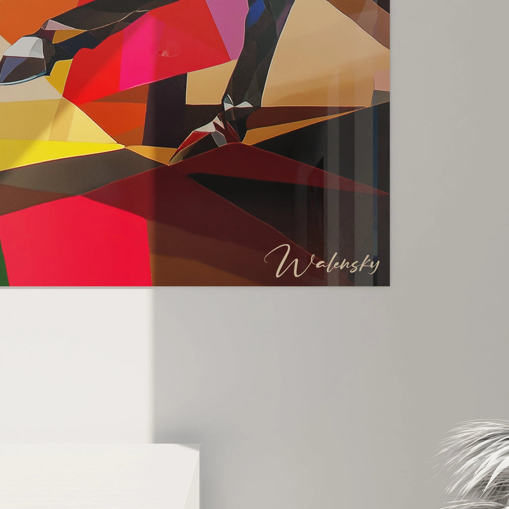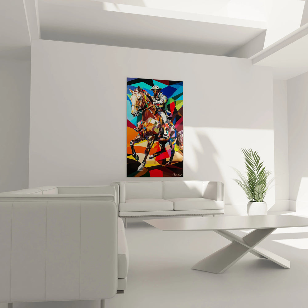 Cette œuvre moderne célèbre l’héritage de Théodore Géricault avec un souffle contemporain. Le moment de la charge, figé dans un kaléidoscope de formes géométriques dynamiques, vous invite à ressentir le fracas du galop et l’élan indomptable de l’officier à cheval. L’alchimie des couleurs — bleu profond, rouge incandescent et touches vibrantes — enveloppe votre regard, éveillant un sentiment d’admiration et d’inspiration.