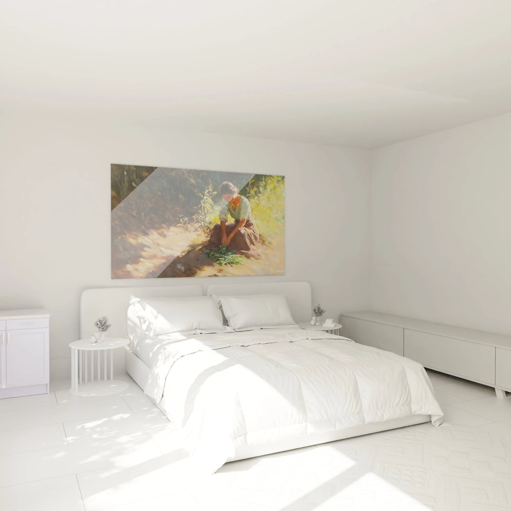 Au premier regard, vous ĂȘtes captivĂ© par une scĂšne qui respire la sĂ©rĂ©nitĂ© : une paysanne planta avec soin ses Ă©chalotes, incarnant la beautĂ© simple et puissante des gestes quotidiens. La douceur des tons naturels, allant du vert profond aux nuances chaudes de beige et de marron, enveloppe la composition dâune atmosphĂšre chaleureuse et apaisante.