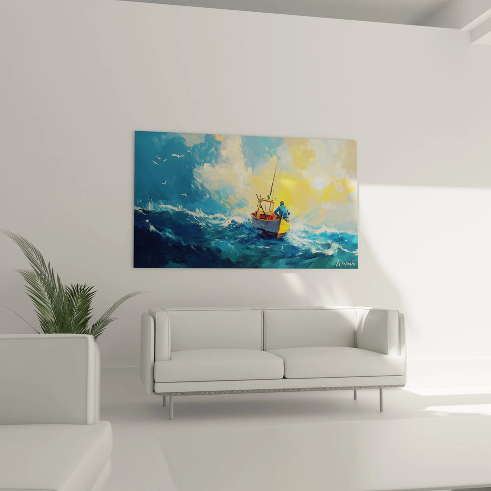 Imaginez un instant suspendu entre ciel et océan, où la lumière dorée transperce les nuages pour embrasser la mer agitée. Ce tableau saisit cette rencontre intime entre l’homme et les éléments, un équilibre fragile qui vous transporte au cœur d’une aventure intense et contemplative.
