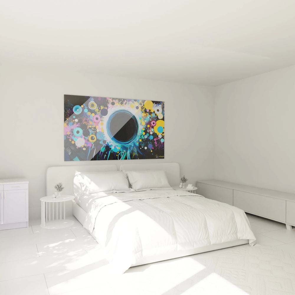 Au centre, un cercle noir intense attire votre regard comme un puits sans fond, concentrant toute lâattention et Ă©voquant Ă la fois le silence absolu et la force gravitationnelle dâun trou noir. Autour, des cercles colorĂ©s dans des nuances dĂ©licates de bleu Ă©lectrique et de jaune Ă©clatant dansent en harmonie, rappelant la danse des planĂštes et la vie en perpĂ©tuel mouvement. Cet Ă©quilibre subtil entre le calme mystĂ©rieux et la vitalitĂ© lumineuse crĂ©e une ambiance captivante, parfaite pour stimuler votre esprit tout en apaisant vos sens.