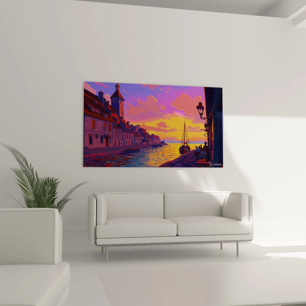 Replongez à travers ce tableau dans l’univers fascinant des ports historiques, où la lumière danse sur l’eau et les bâtisses anciennes s’animent sous le feu du crépuscule. Cette pièce est un hommage à la beauté passée, revisité avec une palette vibrante et élégante qui enrichira votre intérieur d’une note classique et sophistiquée.