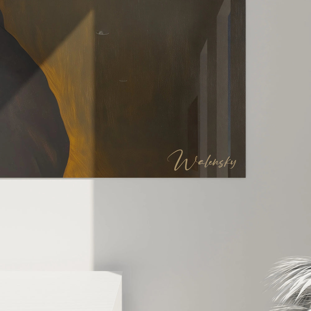 Avec ses contrastes maîtrisés entre ombre profonde et lumière délicate, la composition offre une expérience visuelle immersive. Vous sentirez presque la texture des tissus, la fraîcheur du col plissé et la sérénité enveloppante qui émane de ce portrait, prêt à enrichir votre intérieur d’une atmosphère calme mais pleine de mystère.