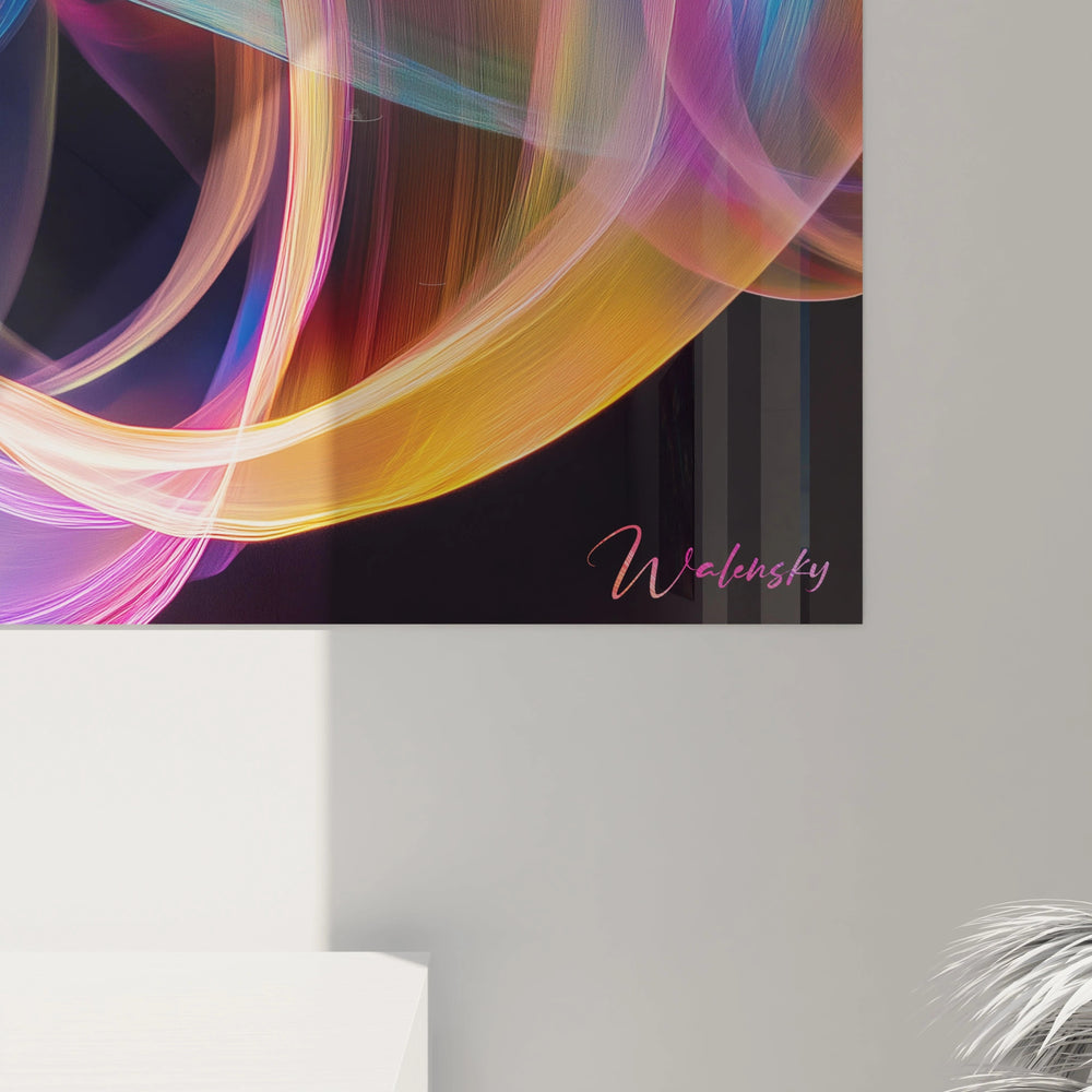 Porté par une palette électrique mêlant bleu profond, rose intense et orange lumineux, ce tableau crée un contraste saisissant contre son fond noir abyssal. Les lignes fluides s’entrelacent dans un mouvement presque hypnotique, évoquant une matière en suspension, fluide et vibrante. Chaque nuance, chaque courbe donne l’impression d’une énergie inépuisable, d’un prisme où la lumière se décompose en une danse infinie.