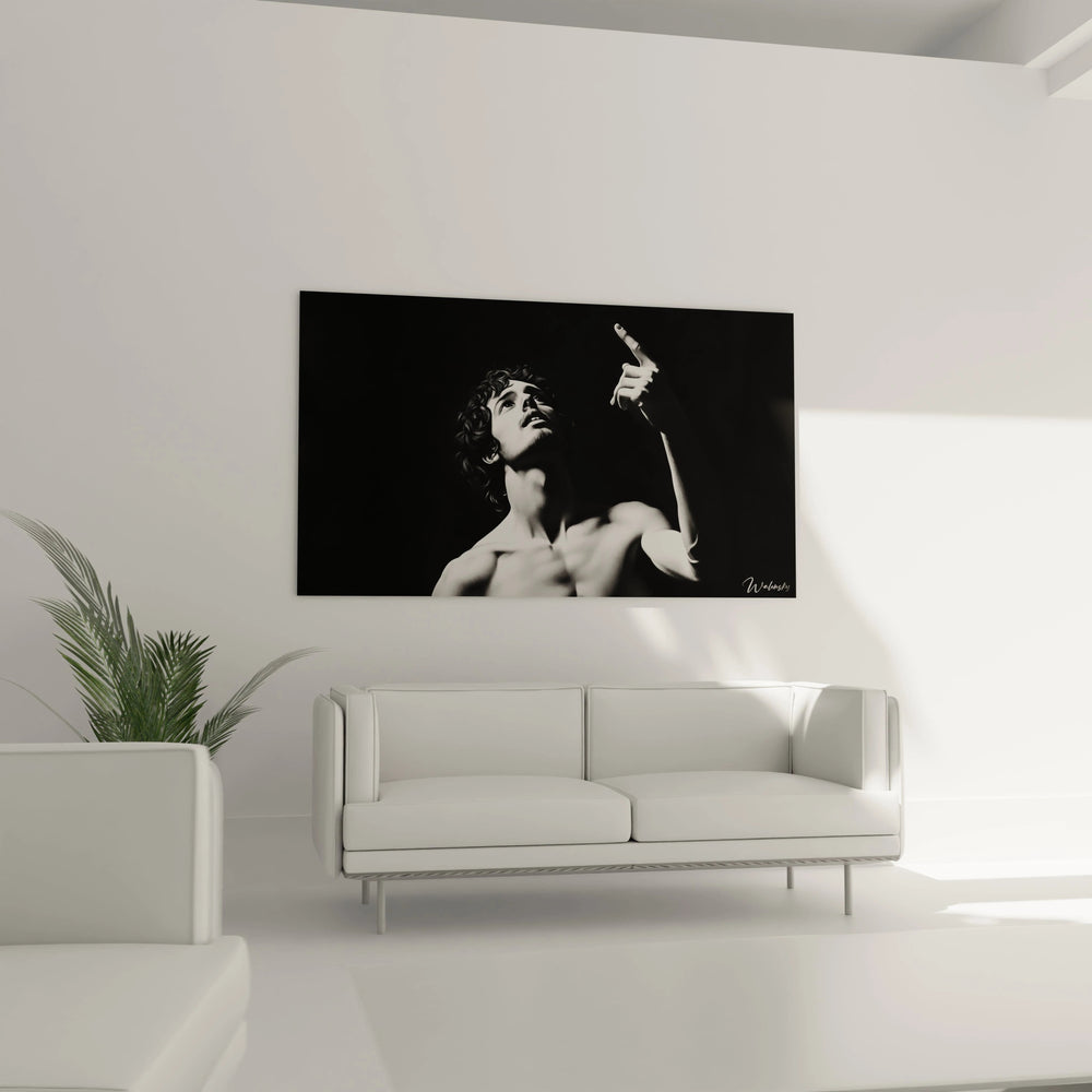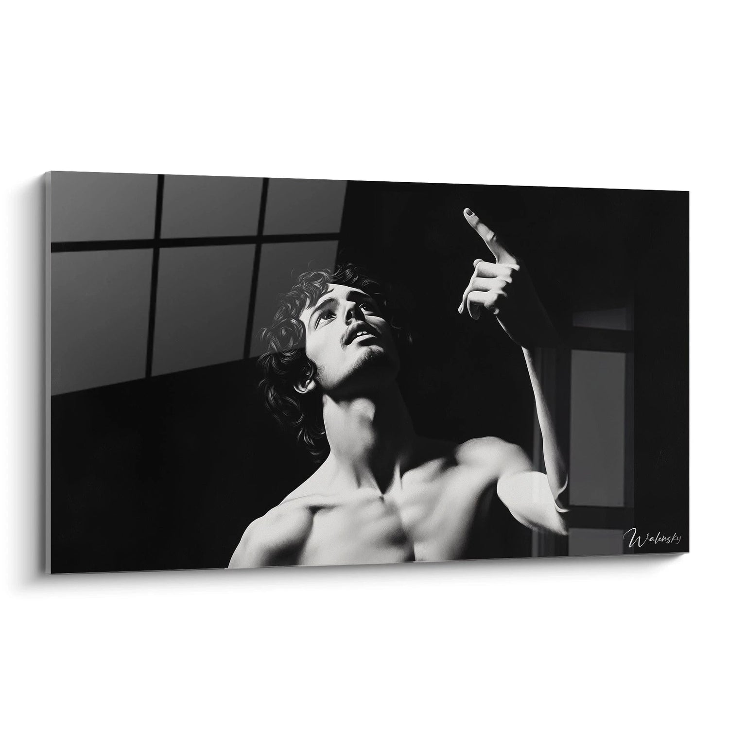 La puissance de ce tableau repose sur l'art subtile du clair-obscur. L’arrière-plan plongé dans une obscurité mystérieuse semble envelopper le personnage, mettant en relief chaque fin détail de son visage et de sa posture. Vous pouvez presque sentir la tension entre l’ombre et la lumière, comme une invitation à découvrir ce qui se cache derrière ce regard intense, levé vers un horizon invisible. Chaque nuance de noir, blanc et gris révèle une histoire captivante, où chaque trait de pinceau joue avec la profondeur et la texture.