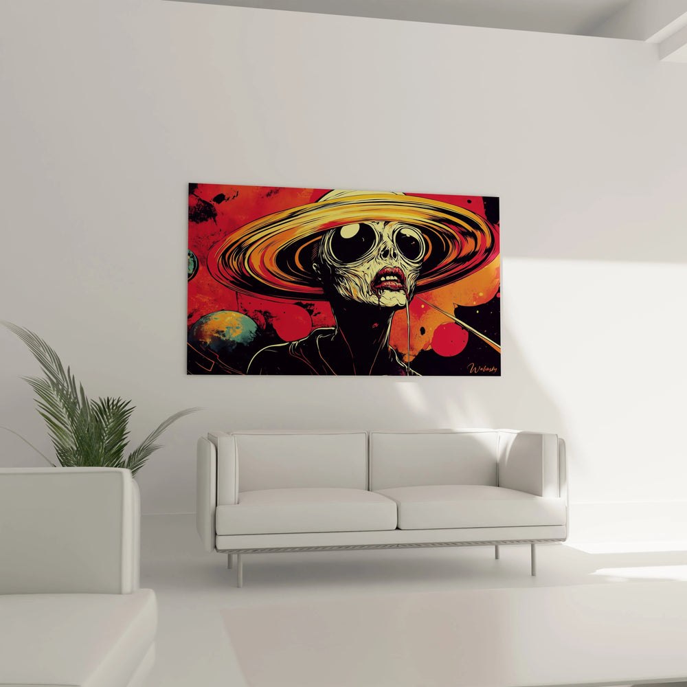 Imaginez un espace où chaque couleur raconte une histoire, où le rouge incandescent et l’orange vibrant s’entrelacent pour insuffler une énergie ardente à votre intérieur, tandis que le noir profond joue avec les ombres, créant une profondeur hypnotique. Ce tableau saisit la dualité entre puissance et étrangeté, capturant un visage énigmatique enveloppé d’un anneau évoquant Saturne, qui semble surgir d’un autre cosmos.