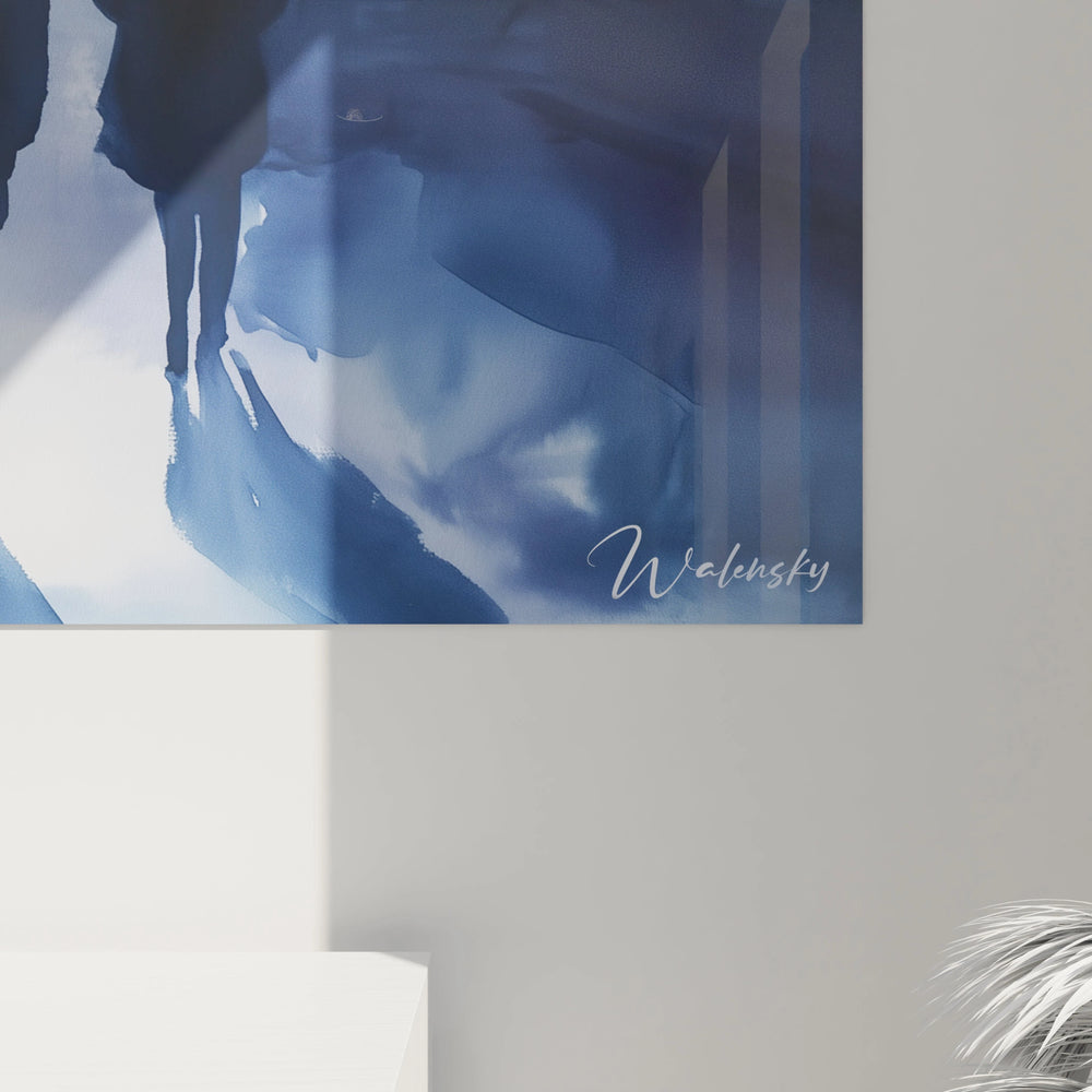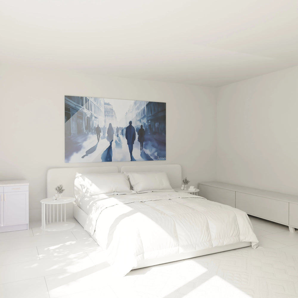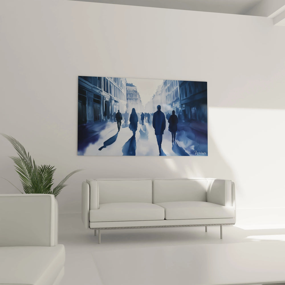 Imaginez-vous déambulant au cœur d’une avenue à la tombée du jour, les contours flous des passants se fondant dans un voile lumineux, où chaque silhouette raconte une histoire d’introspection silencieuse. La douceur des transitions colorées, dans une gamme subtile de bleus et gris, évoque la froideur enveloppante d’une soirée urbaine chargée d’émotions et de mystères. Ce tableau vous invite à ressentir ce moment suspendu, quasi onirique, où chaque regard s’éloigne sans se toucher, comme une invitation à la réflexion intime au cœur du tumulte extérieur.