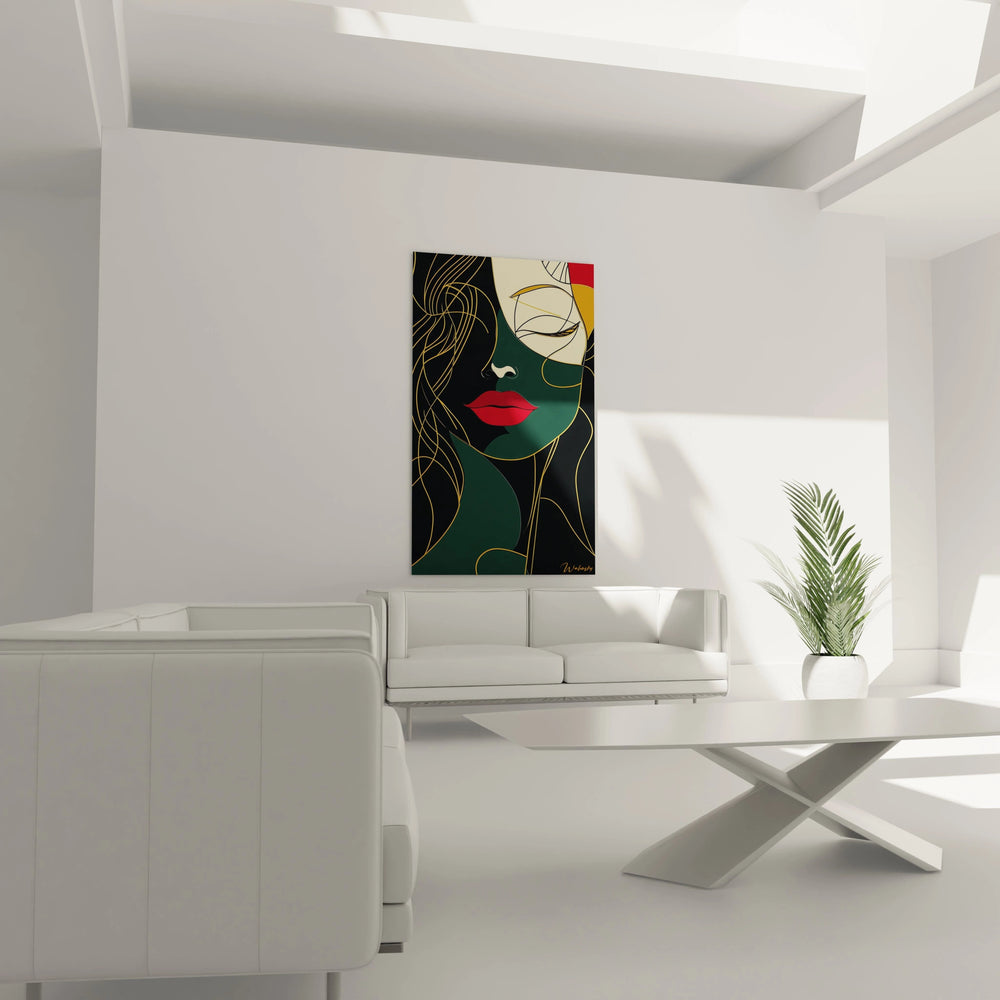Imaginez une silhouette féminine esquissée avec des contours noirs précis, bercée par des lignes dorées qui glissent comme un fil invisible reliant conseil et passion. L’absence de détails faciaux permet à chaque regard de s’approprier l’image, faisant de ce tableau un miroir intime de vos propres émotions. La palette choisie – rouge profond, beige doux et noir profond – crée un équilibre parfait entre intensité et sérénité, éveillant une atmosphère à la fois énergique et apaisante dans votre espace.