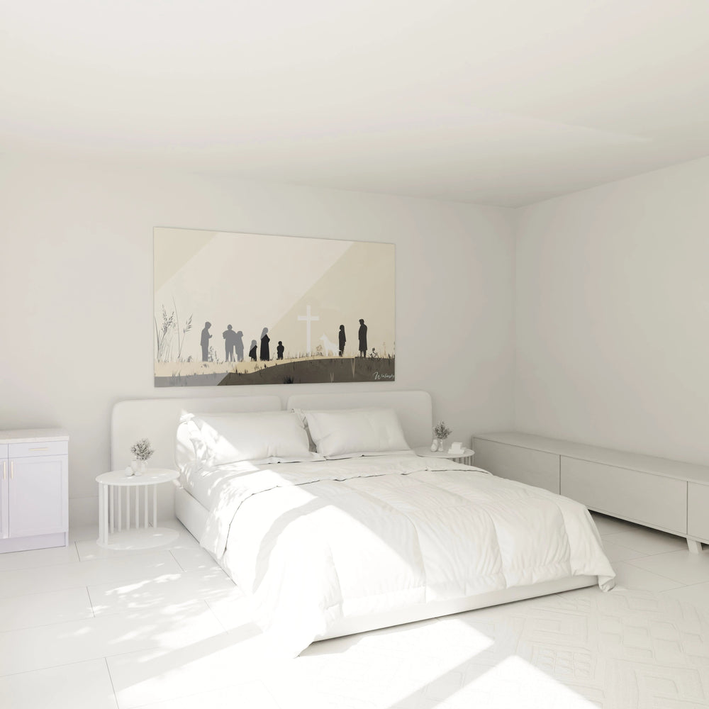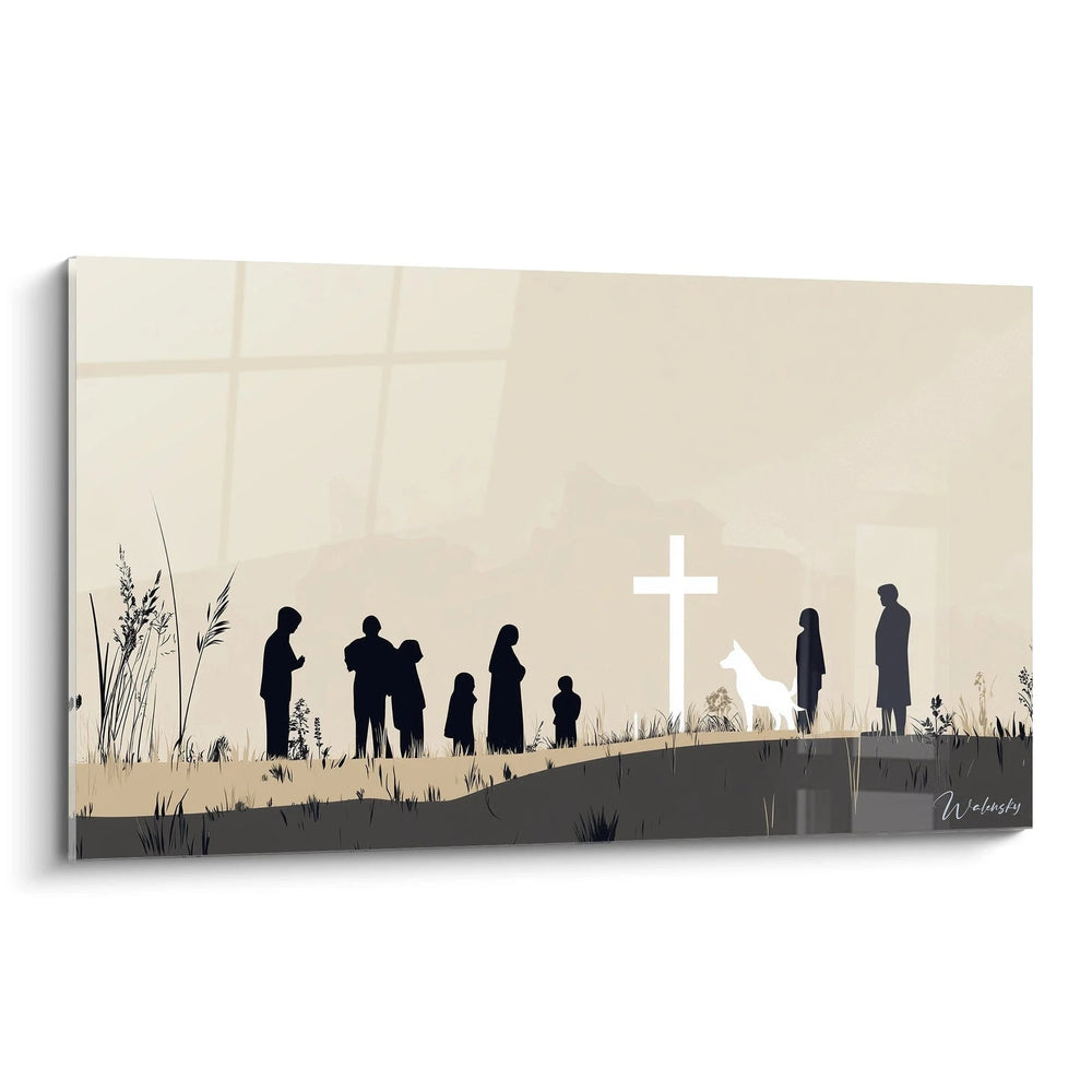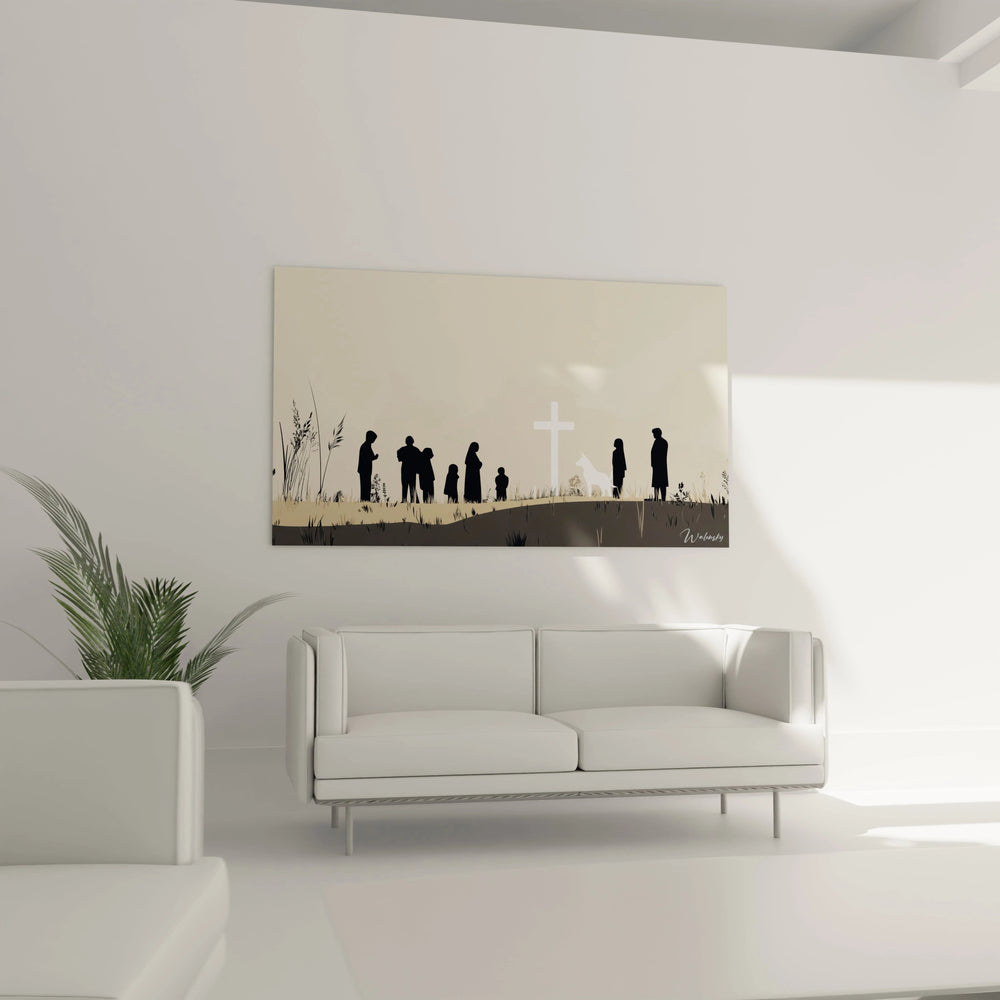 Imaginez-vous face à cette scène harmonieuse où des silhouettes sombres forment un cercle d’unité, délicatement éclairé par une croix lumineuse qui symbolise la mémoire et la foi universelle. Le chien blanc, présence discrète mais puissante, apporte une touche de pureté et de loyauté, amplifiant le sentiment d’apaisement qui se dégage de l’ensemble.