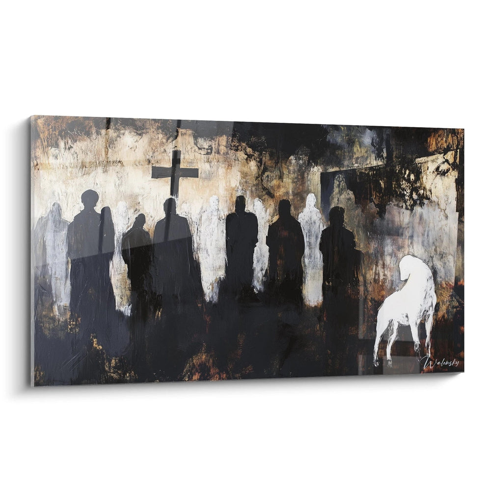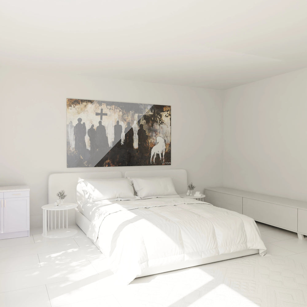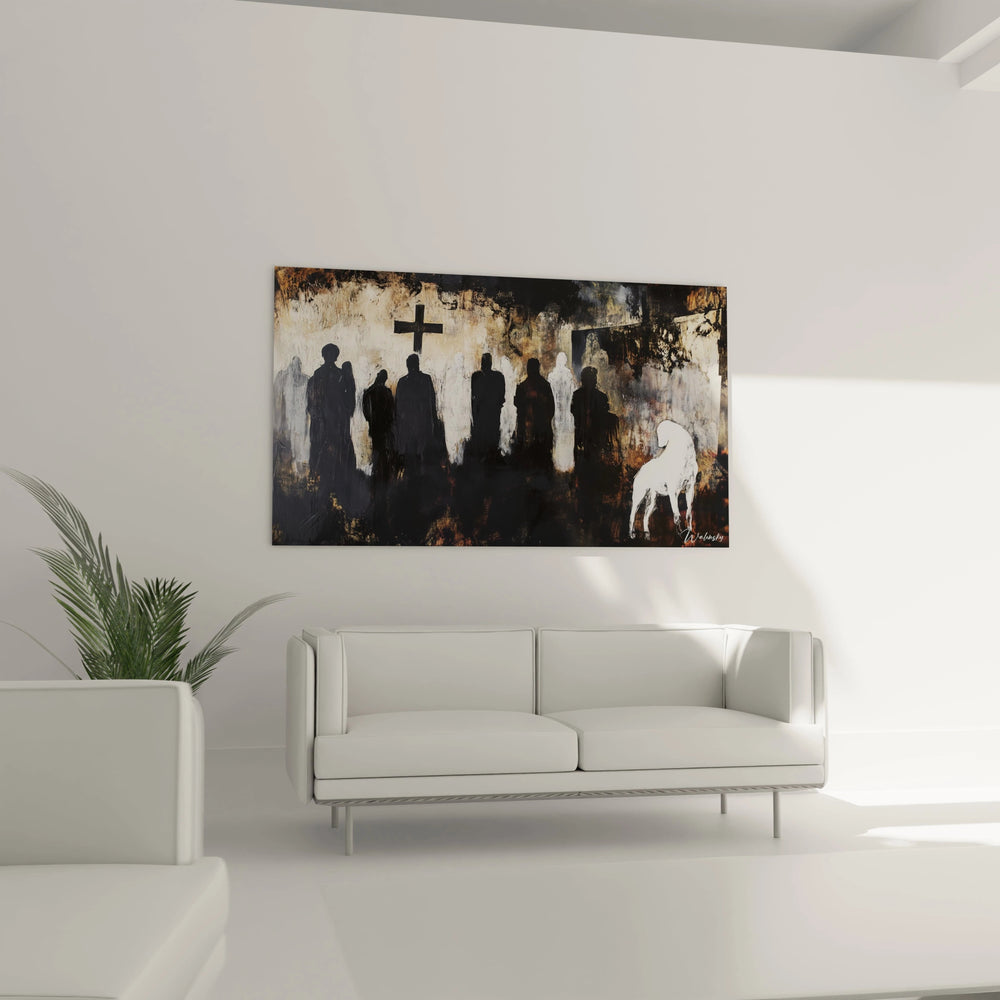 Au centre de la composition, la silhouette de la croix noire agit comme un point d’ancrage symbolique, reliant le tangible à l’intangible. Les figures sombres incarnent ce poids invisible que nous portons, tandis que les formes blanches semblent s’élever, offrant une perspective de renouveau et de paix intérieure.