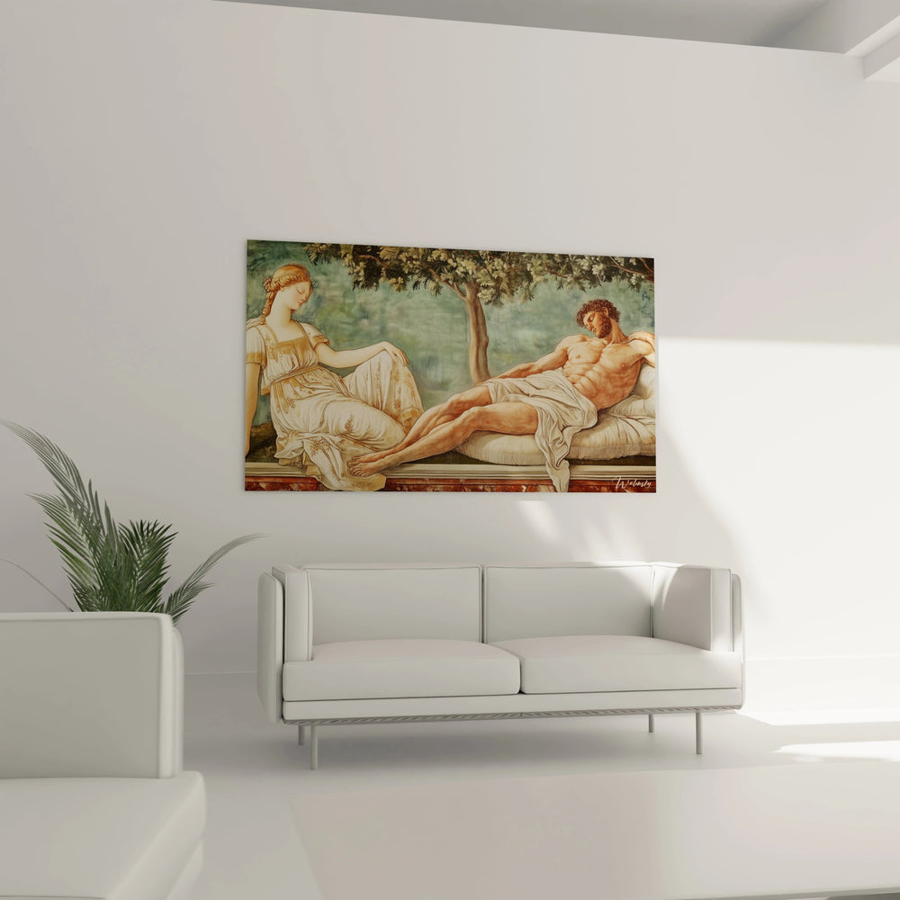 Imaginez une Ćuvre qui transcende le temps et invite Ă la contemplation dâun Ă©quilibre parfait entre force et douceur, lumiĂšre et ombre. Ce tableau, inspirĂ© par lâemblĂ©matique VĂ©nus et Mars de Sandro Botticelli, vous plonge dans un univers suspendu oĂč la grĂące renaĂźt sous vos yeux. Chaque coup de pinceau raconte lâhistoire dâune union harmonieuse, dâune rencontre entre des figures intemporelles qui Ă©voquent la beautĂ© classique dans toute sa splendeur.